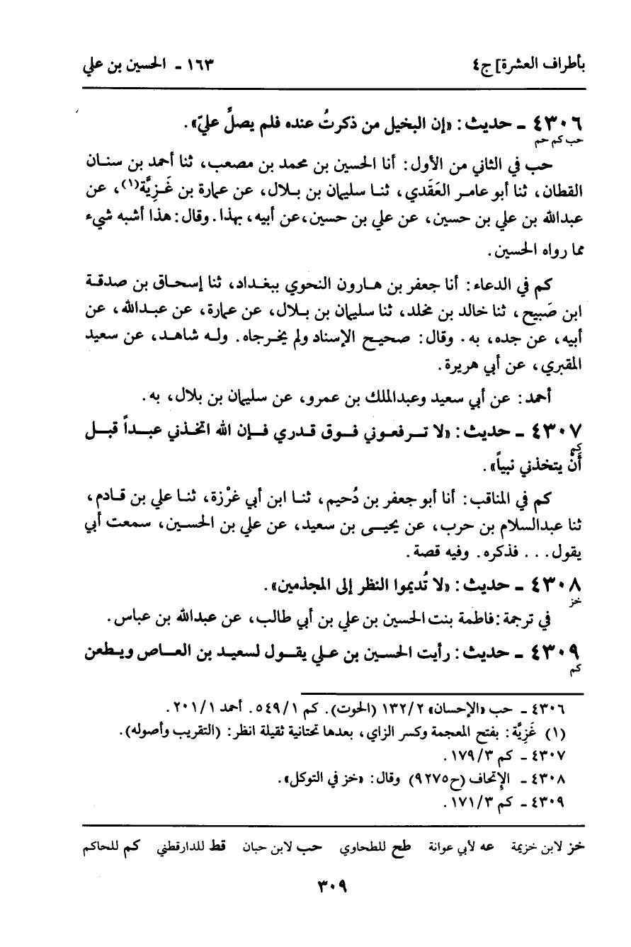 4306 - حَدِيثٌ (حب كم حم) : “ إِنَّ الْبَخِيلَ مَنْ ذُكِرْتُ عِنْدَهُ فَلَمْ يُصَلِّ عَلَيَّ “. حب فِي الثَّانِي مِنَ الأَوَّلِ: أنا الْحُسَيْنُ بْنُ مُحَمَّدِ بْنِ مُصْعَبٍ، ثنا أَحْمَدُ بْنُ سِنَانٍ الْقَطَّانُ، ثنا أَبُو عَامِرٍ الْعَقَدِيُّ، ثنا سُلَيْمَانُ بْنُ بِلالٍ، عَنْ عُمَارَةَ بْنِ غَزِيَّةَ، عَنْ عَبْدِ اللَّهِ بْنِ عَلِيِّ بْنِ حُسَيْنٍ، عَنْ عَلِيِّ بْنِ حُسَيْنٍ، عَنْ أَبِيهِ، بِهَذَا. وَقَالَ: هَذَا أَشْبَهُ شَيْءٍ مِمَّا رَوَاهُ الْحُسَيْنُ. كم فِي الدُّعَاءِ: أنا جَعْفَرُ بْنُ هَارُونَ النَّحْوِيُّ بِبَغْدَادَ، ثنا إِسْحَاقُ بْنُ صَدَقَةَ بْنِ صَبِيحٍ، ثنا خَالِدُ بْنُ مَخْلَدٍ، ثنا سُلَيْمَانُ بْنُ بِلالٍ، عَنْ عُمَارَةَ، عَنْ عَبْدِ اللَّهِ، عَنْ أَبِيهِ، عَنْ جَدِّهِ، بِهِ. وَقَالَ: صَحِيحُ الإِسْنَادِ وَلَمْ يُخَرِّجَاهُ. وَلَهُ شَاهِدٌ، عَنْ سَعِيدٍ الْمَقْبُرِيِّ، عَنْ أَبِي هُرَيْرَةَ. أَحْمَدُ: عَنْ أَبِي سَعِيدٍ، وَعَبْدِ الْمَلِكِ بْنِ عَمْرٍو، عَنْ سُلَيْمَانَ بْنِ بِلالٍ، بِهِ.