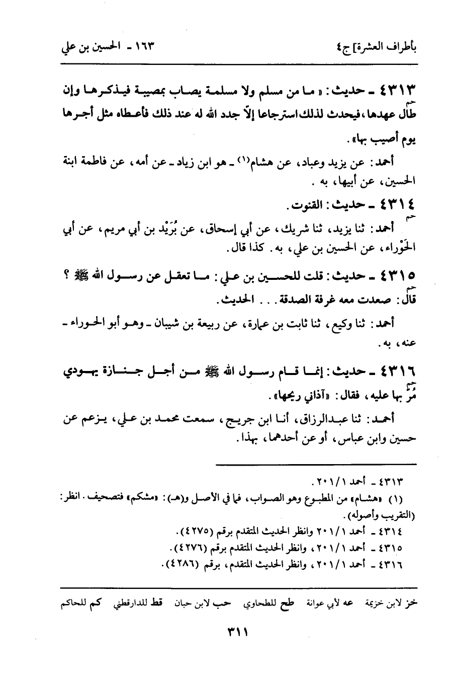 4313 - حَدِيثٌ (حم) : " مَا مِنْ مُسْلِمٍ وَلا مُسْلِمَةٍ يُصَابُ بِمُصِيبَةٍ فَيَذْكُرُهَا وَإِنْ طَالَ عَهْدُهَا، فَيُحْدِثُ لِذَلِكَ اسْتِرْجَاعًا إِلا جَدَّدَ اللَّهُ عِنْدَ ذَلِكَ فَأَعْطَاهُ مِثْلَ أَجْرِهَا يَوْمَ أُصِيبَ بِهَا ". أَحْمَدُ: عَنْ يَزِيدَ، وَعَبَّادٍ، عَنْ هِشَامٍ هُوَ ابْنُ زِيَادٍ، عَنْ أُمِّهِ، عَنْ فَاطِمَةَ ابْنَةِ الْحُسَيْنِ، عَنْ أَبِيهَا، بِهِ.