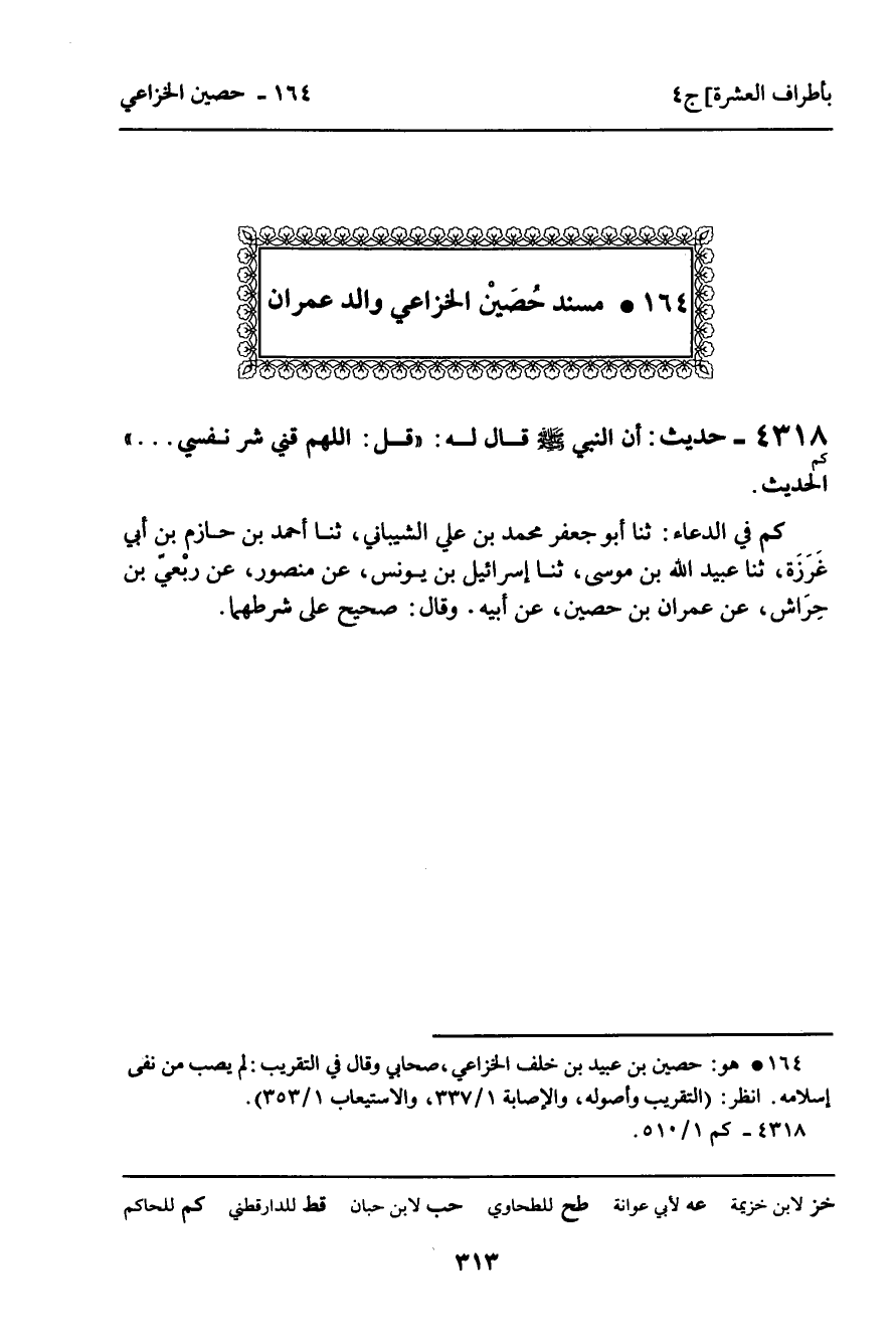 4318 - حَدِيثٌ (كم) : أَنَّ النَّبِيَّ صَلَّى اللَّهُ عَلَيْهِ وَسَلَّمَ قَالَ لَهُ: " قُلِ: اللَّهُمَّ قِنِي شَرَّ نَفْسِي. . . " الْحَدِيثَ. كم فِي الدُّعَاءِ: ثنا أَبُو جَعْفَرٍ مُحَمَّدُ بْنُ عَلِيٍّ الشَّيْبَانِيُّ، ثنا أَحْمَدُ بْنُ حَازِمِ بْنِ أَبِي غَرْزَةَ، ثنا عُبَيْدُ اللَّهِ بْنُ مُوسَى، ثنا إِسْرَائِيلُ بْنُ يُونُسَ، عَنْ مَنْصُورٍ، عَنْ رِبْعِيِّ بْنِ حِرَاشٍ، عَنْ عِمْرَانَ بْنِ حُصَيْنٍ، عَنْ أَبِيهِ. وَقَالَ: صَحِيحٌ عَلَى شَرْطِهِمَا.