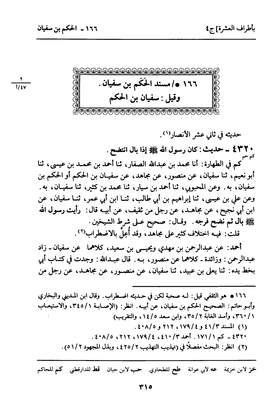4320 - حَدِيثٌ (كم حم) : " كَانَ رَسُولُ اللَّهِ صَلَّى اللَّهُ عَلَيْهِ وَسَلَّمَ إِذَا بَالَ انْتَضَحَ ". كم فِي الطَّهَارَةِ: أنا مُحَمَّدُ بْنُ عَبْدِ اللَّهِ الصَّفَّارُ، ثنا أَحْمَدُ بْنُ مُحَمَّدِ بْنِ عِيسَى، ثنا أَبُو نُعَيْمٍ، ثنا سُفْيَانُ، عَنْ مَنْصُورٍ، عَنْ مُجَاهِدٍ، عَنْ سُفْيَانَ بْنِ الْحَكَمِ أَوِ الْحَكَمِ بْنِ سُفْيَانَ، بِهِ. وَعَنِ الْمَحْبُوبِيِّ، ثنا أَحْمَدُ بْنُ سَيَّارٍ، ثنا مُحَمَّدُ بْنُ كَثِيرٍ، ثنا سُفْيَانُ، بِهِ. وَعَنْ عَلِيِّ بْنِ عِيسَى، ثنا إِبْرَاهِيمُ بْنُ أَبِي طَالِبٍ، ثنا ابْنُ أَبِي عُمَرَ، ثنا سُفْيَانُ، عَنِ ابْنِ أَبِي نَجِيحٍ، عَنْ مُجَاهِدٍ، عَنْ رَجُلٍ مِنْ ثَقِيفٍ، عَنْ أَبِيهِ , قَالَ: رَأَيْتُ رَسُولَ اللَّهِ صَلَّى اللَّهُ عَلَيْهِ وَسَلَّمَ بَالَ ثُمَّ نَضَحَ فَرْجَهُ. وَقَالَ: صَحِيحٌ عَلَى شَرْطِ الشَّيْخَيْنِ. قُلْتُ: فِيهِ اخْتِلافٌ كَثِيرٌ عَلَى مُجَاهِدٍ، وَقَدْ أُعِلَّ بِالاضْطِرَابِ. أَحْمَدُ: عَنْ عَبْدِ الرَّحْمَنِ بْنِ مَهْدِيٍّ، وَيَحْيَى بْنِ سَعِيدٍ، كِلاهُمَا عَنْ سُفْيَانَ زَادَ عَبْدُ الرَّحْمَنِ: وَزَائِدَةُ، كِلاهُمَا عَنْ مَنْصُورٍ، بِهِ. قَالَ عَبْدُ اللَّهِ: وَجَدْتُ فِي كِتَابِ أَبِي بِخَطِّ يَدِهِ: ثنا يَعْلَى بْنُ عُبَيْدٍ، ثنا سُفْيَانُ، عَنْ مَنْصُورٍ، عَنْ مُجَاهِدٍ، عَنْ رَجُلٍ مِنْ