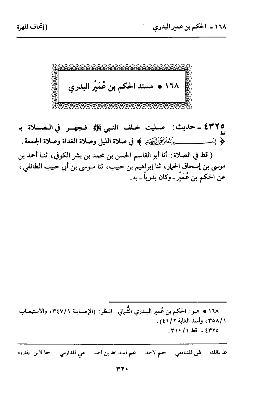 4325 - حَدِيثٌ (قط) : " صَلَّيْتُ خَلْفَ النَّبِيِّ صَلَّى اللَّهُ عَلَيْهِ وَسَلَّمَ فَجَهَرَ فِي الصَّلاةِ ب بِسْمِ اللَّهِ الرَّحْمَنِ الرَّحِيمِ [سورة: الفاتحة، آية 1] فِي صَلاةِ اللَّيْلِ وَصَلاةِ الْغَدَاةِ وَصَلاةِ الْجُمْعَةِ ". قط فِي الصَّلاةِ: أنا أَبُو الْقَاسِمِ الْحَسَنُ بْنُ مُحَمَّدِ بْنِ بِشْرٍ الْكُوفِيُّ، ثنا أَحْمَدُ بْنُ مُوسَى بْنِ إِسْحَاقَ الْحَمَّارُ، ثنا إِبْرَاهِيمُ بْنُ حَبِيبٍ، ثنا مُوسَى بْنُ أَبِي حَبِيبٍ الطَّائِفِيُّ، عَنِ الْحَكَمِ بْنِ عُمَيْرٍ، وَكَانَ بَدْرِيًّا بِهِ.
