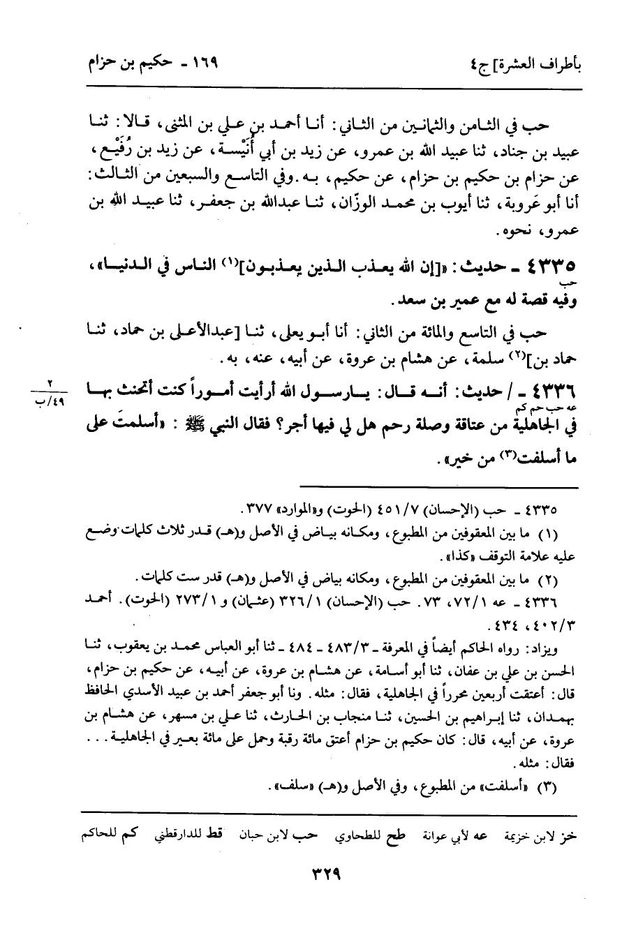 4336 - حَدِيثٌ (عه حب حم كم) : " أَنَّهُ قَالَ: يَا رَسُولَ اللَّهِ أَرَأَيْتَ أُمُورًا كُنْتُ أَتَحَنَّثُ بِهَا فِي الْجَاهِلِيَّةِ مِنْ عِتَاقَةٍ وَصِلَةِ رَحِمٍ هَلْ لِي فِيهَا أَجْرٌ؟ فَقَالَ النَّبِيُّ صَلَّى اللَّهُ عَلَيْهِ وَسَلَّمَ: " أَسْلَمْتَ عَلَى مَا أَسْلَفْتَ مِنْ خَيْرٍ "
