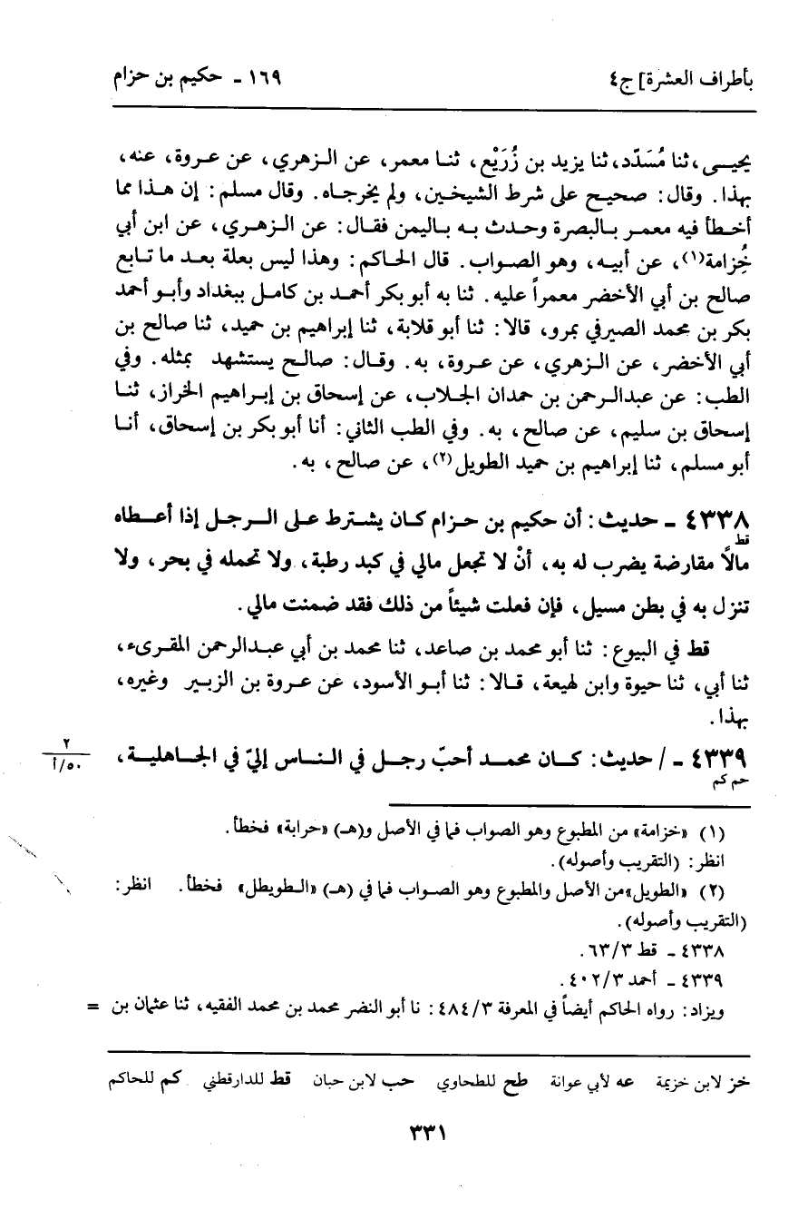 -[332]- فَلَمَّا تَنَبَّأَ وَخَرَجَ إِلَى الْمَدِينَةِ شَهِدَ حَكِيمُ بْنُ حِزَامٍ الْمَوْسِمَ وَهُوَ كَافِرٌ، فَوَجَدَ حُلَّةً لِذِي يَزِنَ تُبَاعُ، فَاشْتَرَاهَا بِخَمْسِينَ دِينَارًا لِيُهْدِيَهَا لِرَسُولِ اللَّهِ صَلَّى اللَّهُ عَلَيْهِ وَسَلَّمَ، فَقَدِمَ بِهَا عَلَيْهِ الْمَدِينَةَ فَأَرَادَهُ عَلَى قَبْضِهَا هَدِيَّةً فَأَبَى. . . " الْحَدِيثَ. أَحْمَدُ: ثنا عَتَّابُ بْنُ زِيَادٍ، أنا عَبْدُ اللَّهِ، أنا لَيْثُ بْنُ سَعْدٍ، حَدَّثَنِي عَبْدُ اللَّهِ بْنُ الْمُغِيرَةِ، عَنْ عِرَاكِ بْنِ مَالِكٍ، عَنْ حَكِيمِ بْنِ حِزَامٍ، قَالَ. . . فَذَكَرَهُ.