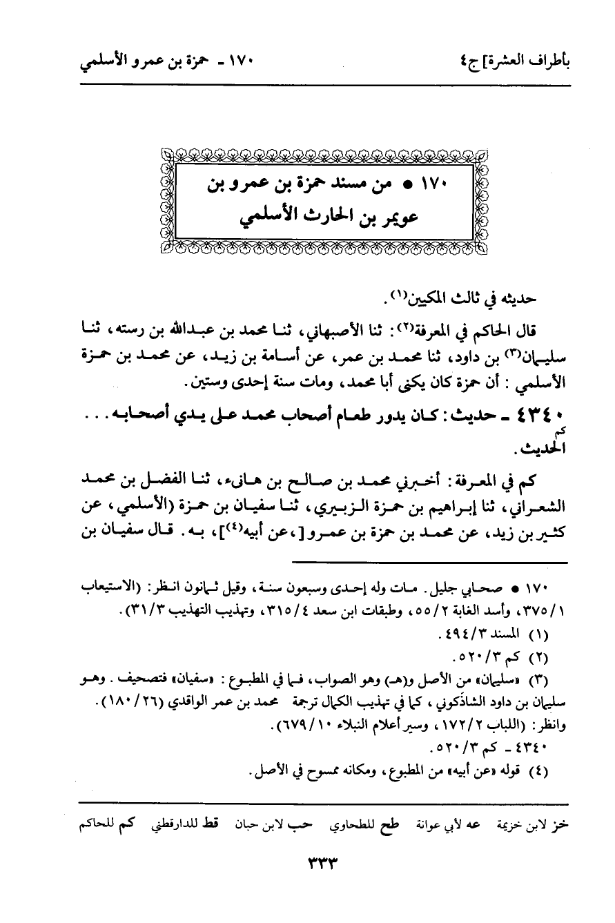 4340 - حَدِيثٌ (كم) : " كَانَ يَدُورُ طَعَامُ أَصْحَابِ مُحَمَّدٍ عَلَى يَدَيْ أَصْحَابِهِ. . . " الْحَدِيثَ. كم فِي الْمَعْرِفَةِ: أَخْبَرَنِي مُحَمَّدُ بْنُ صَالِحِ بْنِ هَانِئٍ، ثنا الْفَضْلُ بْنُ مُحَمَّدٍ الشَّعْرَانِيُّ، ثنا إِبْرَاهِيمُ بْنُ حَمْزَةَ الزُّبَيْرِيُّ، ثنا سُفْيَانُ بْنُ حَمْزَةَ الأَسْلَمِيُّ، عَنْ كَثِيرِ بْنِ زَيْدٍ، عَنْ مُحَمَّدِ بْنِ حَمْزَةَ بْنِ عَمْرٍو، عَنْ أَبِيهِ، بِهِ. قَالَ سُفْيَانُ بْنُ