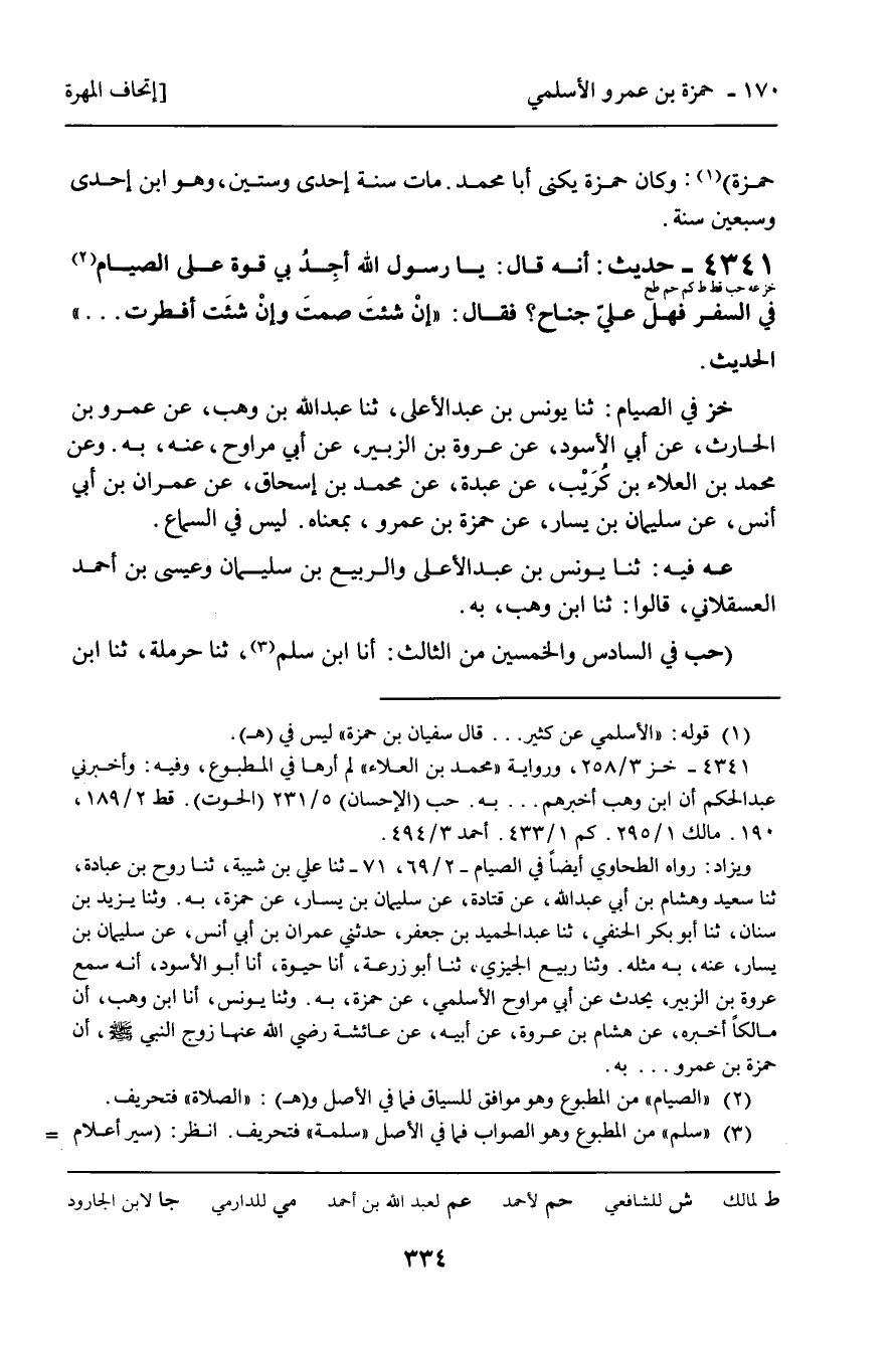 4341 - حَدِيثٌ (خز عه حب قط كم حم طح) : “ أَنَّهُ قَالَ: يَا رَسُولَ اللَّهِ أَجِدُ بِي قُوَّةً عَلَى الصِّيَامِ فِي السَّفَرِ فَهَلْ عَلَيَّ جُنَاحٌ؟ فَقَالَ: “ إِنْ شِئْتَ صُمْتَ وَإِنْ شِئْتَ أَفْطَرْتَ. . . “ الْحَدِيثَ. خز فِي الصِّيَامِ: ثنا يُونُسُ بْنُ عَبْدِ الأَعْلَى، ثنا عَبْدُ اللَّهِ بْنُ وَهْبٍ، عَنْ عَمْرِو بْنِ الْحَارِثِ، عَنْ أَبِي الأَسْوَدِ، عَنْ عُرْوَةَ بْنِ الزُّبَيْرِ، عَنْ أَبِي مُرَاوِحٍ، عَنْهُ، بِهِ. وَعَنْ مُحَمَّدِ بْنِ الْعَلاءِ بْنِ كُرَيْبٍ، عَنْ عَبْدَةَ، عَنْ مُحَمَّدِ بْنِ إِسْحَاقَ، عَنْ عِمْرَانَ بْنِ أَبِي أَنَسٍ، عَنْ سُلَيْمَانَ بْنِ يَسَارٍ، عَنْ حَمْزَةَ بْنِ عَمْرٍو، بِمَعْنَاهُ. لَيْسَ فِي السَّمَاعِ. عه فِيهِ: ثنا يُونُسُ بْنُ عَبْدِ الأَعْلَى، وَالرَّبِيعُ بْنُ سُلَيْمَانَ، وَعِيسَى بْنُ أَحْمَدَ الْعَسْقَلانِيُّ، قَالُوا: ثنا ابْنُ وَهْبٍ، بِهِ.