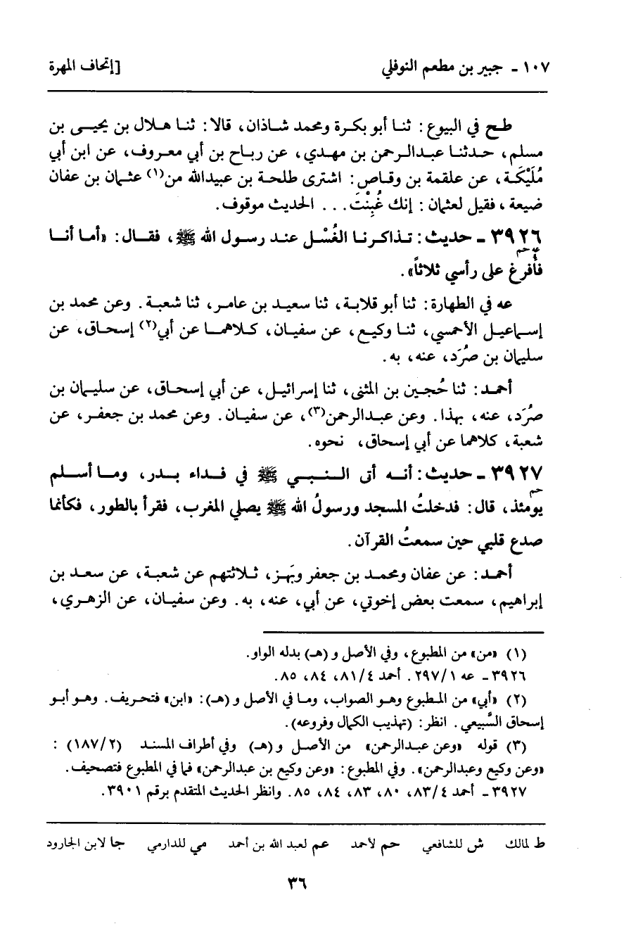 3927 - حَدِيثٌ (حم) : أَنَّهُ أَتَى النَّبِيَّ صَلَّى اللَّهُ عَلَيْهِ وَسَلَّمَ فِي فِدَاءِ بَدْرٍ، وَمَا أَسْلَمَ يَوْمَئِذٍ، قَالَ فَدَخَلْتُ الْمَسْجِدَ وَرَسُولُ اللَّهِ صَلَّى اللَّهُ عَلَيْهِ وَسَلَّمَ يُصَلِّي الْمَغْرِبَ، فَقَرَأَ بِ الطُّورِ، فَكَأَنَّمَا صُدِعَ قَلْبِي حَيْثُ سَمِعْتُ الْقُرْآنِ.