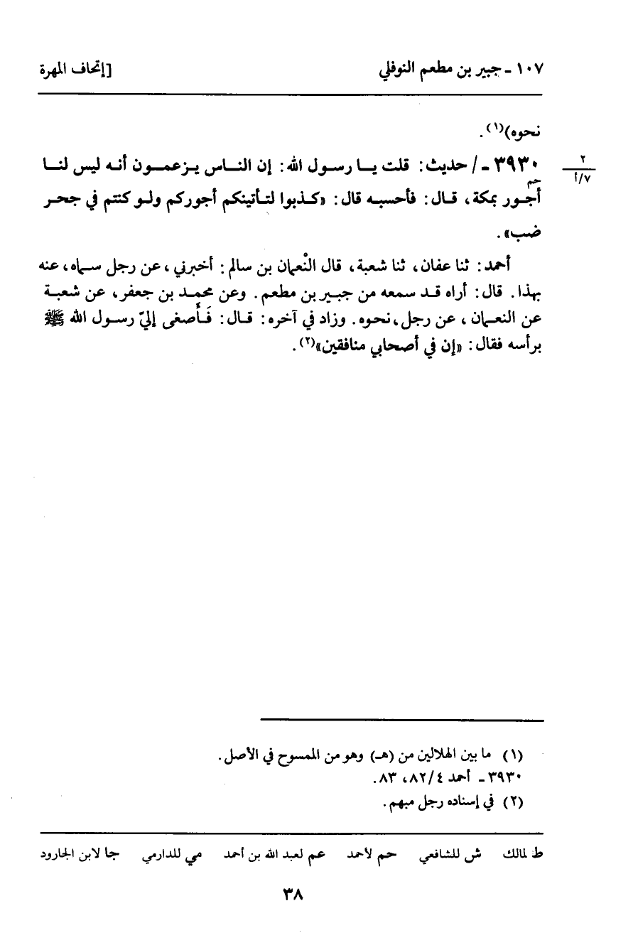 أَحْمَدُ: ثنا عَفَّانُ، ثنا شُعْبَةُ، قَالَ النُّعْمَانُ بْنُ سَالِمٍ: أَخْبَرَنِي، عَنْ رَجُلٍ سَمَّاهُ، عَنْهُ بِهَذَا. قَالَ: أَرَاهُ قَدْ سَمِعَهُ مِنْ جُبَيْرِ بْنِ مُطْعِمٍ. وَعَنْ مُحَمَّدِ بْنِ جَعْفَرٍ، عَنْ شُعْبَةَ، عَنِ النُّعْمَانِ، عَنْ رَجُلٍ، نَحْوَهُ. وَزَادَ فِي آخِرِهِ: قَالَ: فَأَصْغَى إِلَيَّ رَسُولُ اللَّهِ صَلَّى اللَّهُ عَلَيْهِ وَسَلَّمَ بِرَأْسِهِ فَقَالَ: " إِنَّ فِي أَصْحَابِي مُنَافِقِينَ ".