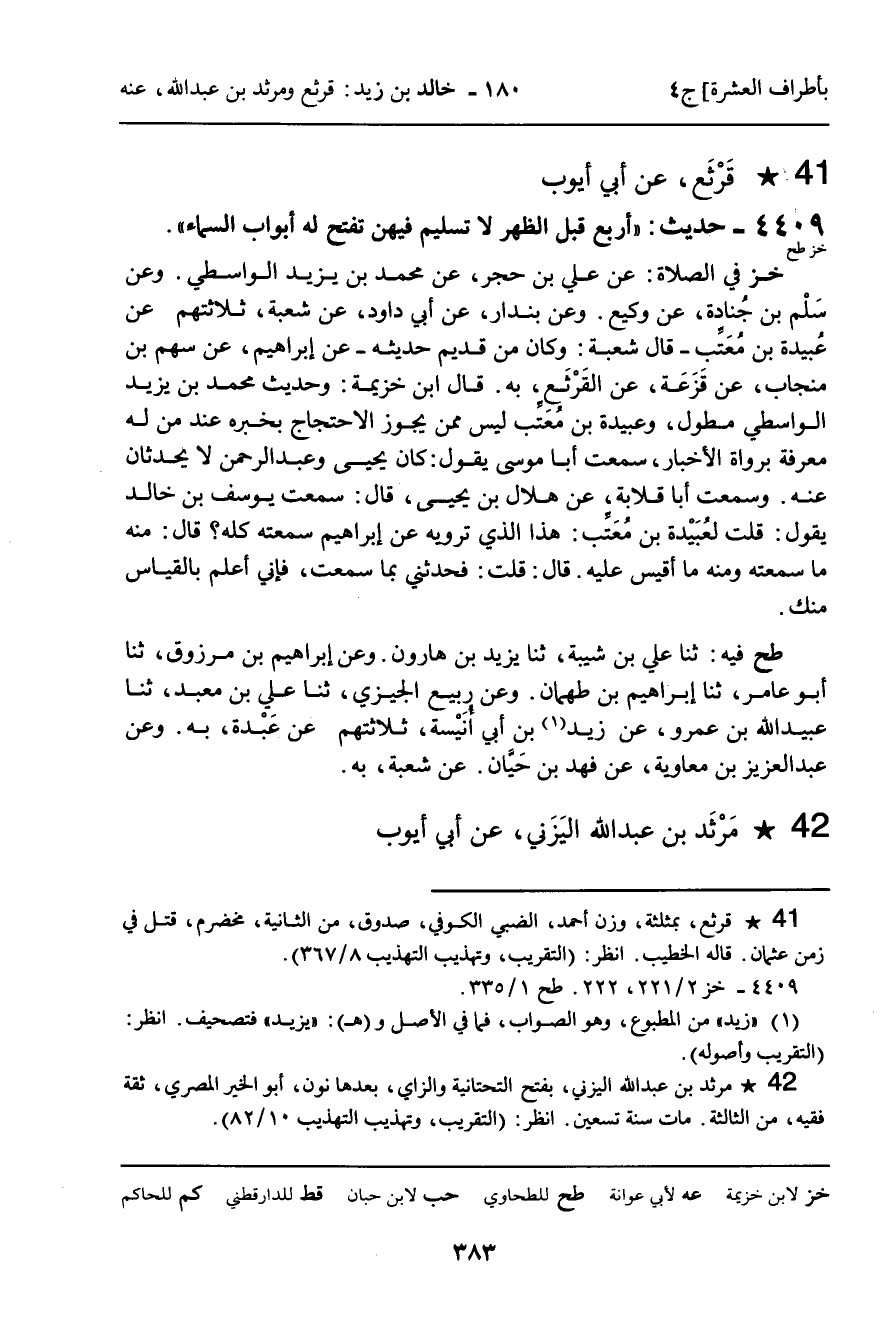 4409 - حَدِيثٌ (خز طح) : " أَرْبَعٌ قَبْلَ الظُّهْرِ لا تَسْلِيمَ فِيهِنَّ تَفْتَحُ لَهُ أَبْوَابَ السَّمَاءِ ". خز فِي الصَّلاةِ: عَنْ عَلِيِّ بْنِ حُجْرٍ، عَنْ مُحَمَّدِ بْنِ يَزِيدَ الْوَاسِطِيِّ. وَعَنْ سَلْمِ بْنِ جُنَادَةَ، عَنْ وَكِيعٍ. وَعَنْ بُنْدَارٍ، عَنْ أَبِي دَاوُدَ، عَنْ شُعْبَةَ، ثَلاثَتُهُمْ عَنْ عُبَيْدَةَ بْنِ مُعَتِّبٍ، قَالَ شُعْبَةُ: وَكَانَ مِنْ قَدِيمِ حَدِيثِهِ، عَنْ إِبْرَاهِيمَ، عَنْ سَهْمِ بْنِ مِنْجَابٍ، عَنْ قَزَعَةَ، عَنِ الْقَرْثَعِ، بِهِ. قَالَ ابْنُ خُزَيْمَةَ: وَحَدِيثُ مُحَمَّدِ بْنِ يَزِيدَ الْوَاسِطِيِّ مُطَوَّلٌ، وَعُبَيْدَةُ بْنُ مُعَتِّبٍ لَيْسَ مِمَّنْ يَجُوزُ الاحْتِجَاجُ بِخَبَرِهِ عِنْدَ مَنْ لَهُ مَعْرِفَةٌ بِرُوَاةِ الأَخْبَارِ، سَمِعْتُ أَبَا مُوسَى يَقُولُ: كَانَ يَحْيَى، وَعَبْدُ الرَّحْمَنِ لا يُحَدِّثَانِ عَنْهُ. وَسَمِعْتُ أَبَا قِلابَةَ، عَنْ هِلالِ بْنِ يَحْيَى، قَالَ: سَمِعْتُ يُوسُفَ بْنَ خَالِدٍ، يَقُولُ: قُلْتُ لِعُبَيْدَةَ بْنِ مُعَتِّبٍ: هَذَا الَّذِي تَرْوِيهِ، عَنْ إِبْرَاهِيمَ سَمِعْتُهُ كُلَّهُ؟ قَالَ: مِنْهُ مَا سَمِعْتُهُ وَمِنْهُ مَا أَقِيسُ عَلَيْهِ. قَالَ: قُلْتُ: فَحَدِّثْنِي بِمَا سَمِعْتَ، فَإِنِّي أَعْلَمُ بِالْقِيَاسِ مِنْكَ. طح فِيهِ: ثنا عَلِيُّ بْنُ شَيْبَةَ، ثنا يَزِيدُ بْنُ هَارُونَ. وَعَنْ إِبْرَاهِيمَ بْنِ مَرْزُوقٍ، ثنا أَبُو عَامِرٍ، ثنا إِبْرَاهِيمُ بْنُ طَهْمَانَ. وَعَنْ رَبِيعٍ الْجِيزِيِّ، ثنا عَلِيُّ بْنُ مَعْبَدٍ، ثنا عُبَيْدُ اللَّهِ بْنُ عَمْرٍو، عَنْ زَيْدِ بْنِ أَبِي أُنَيْسَةَ، ثَلاثَتُهُمْ عَنْ عَبْدَةَ، بِهِ.