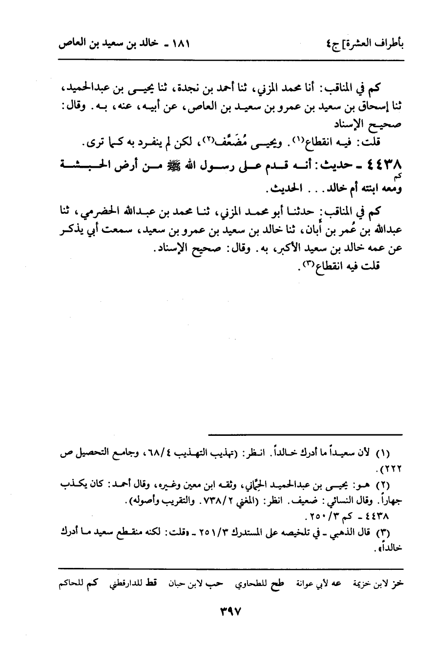 4438 - حَدِيثٌ (كم) : " أَنَّهُ قَدِمَ عَلَى رَسُولِ اللَّهِ صَلَّى اللَّهُ عَلَيْهِ وَسَلَّمَ مِنْ أَرْضِ الْحَبَشَةِ وَمَعَهُ ابْنَتُهُ أُمُّ خَالِدٍ. . . " الْحَدِيثَ.