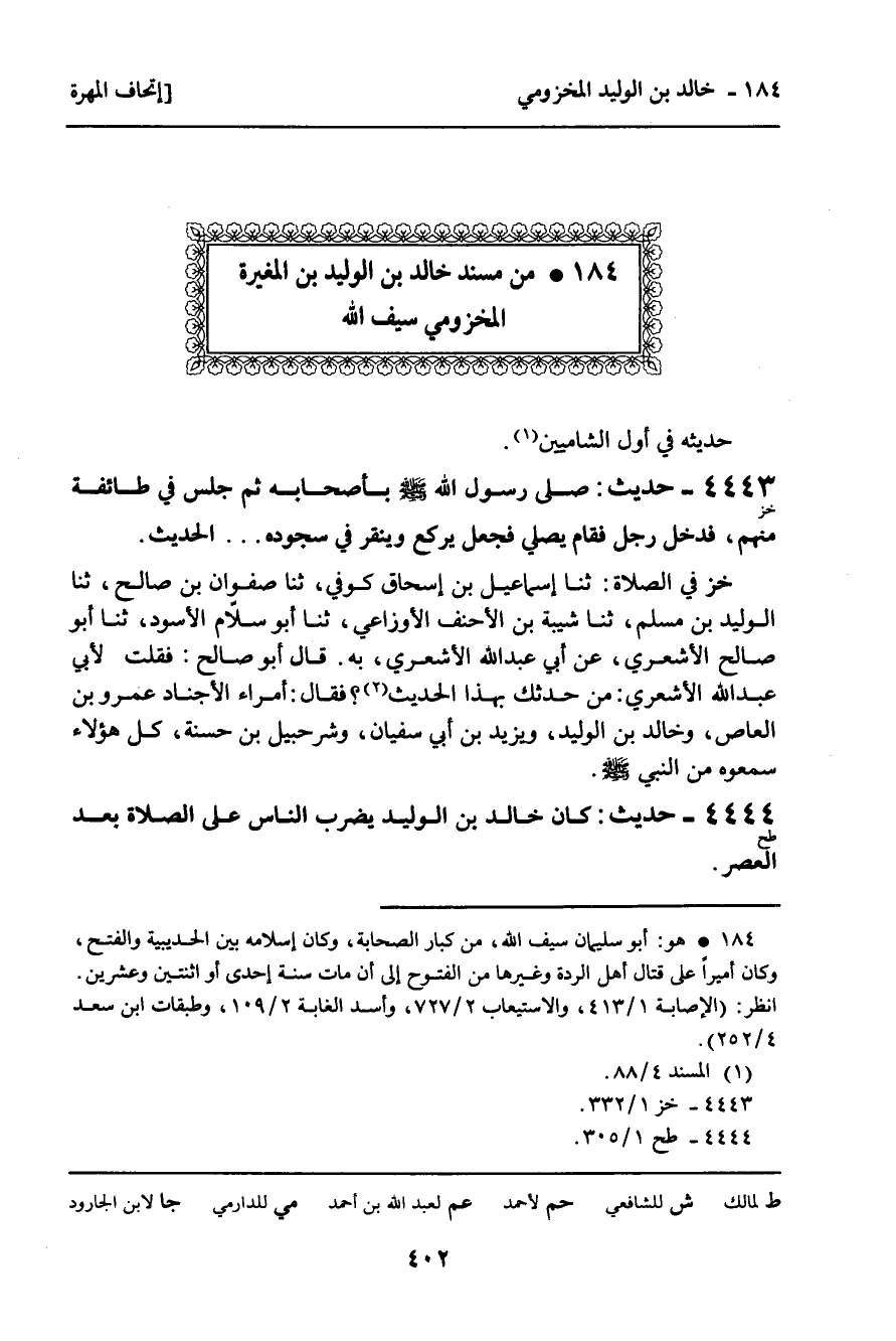 184 ـ مِنْ مُسْنَدِ خَالِدِ بْنِ الْوَلِيدِ بْنِ الْمُغِيرَةِ الْمَخْزُومِيِّ سَيْفِ اللَّهِ