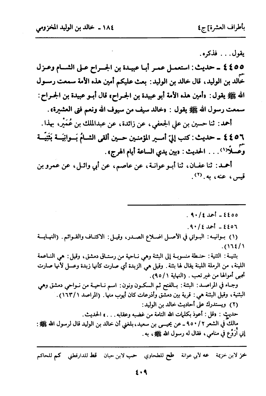 4455 - حَدِيثٌ (حم) : " اسْتَعْمَلَ عُمَرُ أَبَا عُبَيْدَةَ بْنَ الْجَرَّاحِ عَلَى الشَّامِ وَعَزَلَ خَالِدَ بْنَ الْوَلِيدِ، قَالَ خَالِدُ بْنُ الْوَلِيدِ: بُعِثَ عَلَيْكُمْ أَمِينُ هَذِهِ الأُمَّةِ سَمِعْتُ رَسُولَ اللَّهِ صَلَّى اللَّهُ عَلَيْهِ وَسَلَّمَ يَقُولُ: " أَمِينُ هَذِهِ الأُمَّةِ أَبُو عُبَيْدَةَ بْنُ الْجَرَّاحِ ".