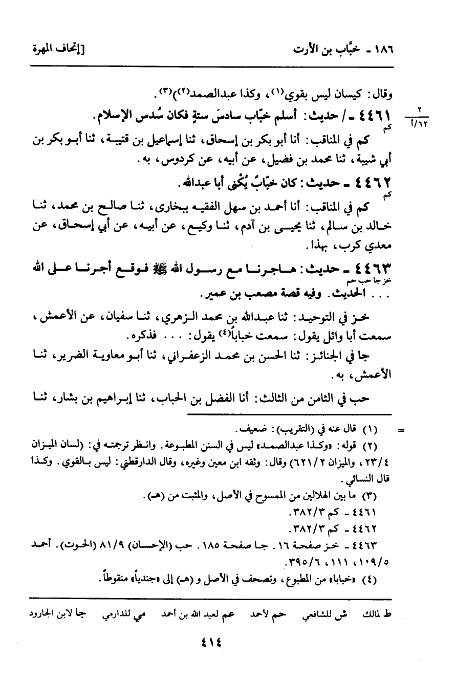 4462 - حَدِيثٌ (كم) : " كَانَ خَبَّابٌ يُكْنَى أَبَا عَبْدِ اللَّهِ ".