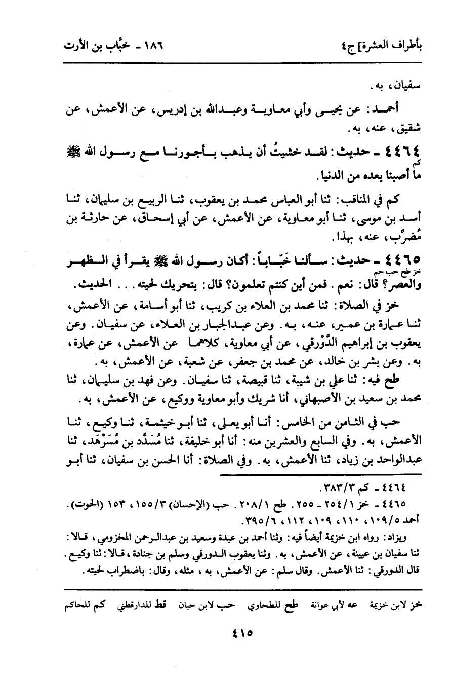 4465 - حَدِيثٌ (خز طح حب حم) : " سَأَلْنَا خَبَّابًا: أَكَانَ رَسُولُ اللَّهِ صَلَّى اللَّهُ عَلَيْهِ وَسَلَّمَ يَقْرَأُ فِي الظُّهْرِ وَالْعَصْرِ؟ قَالَ: نَعَمْ. فَمِنْ أَيْنَ كُنْتُمْ تَعْلَمُونَ؟ قَالَ: بِتَحْرِيكِ لِحْيَتِهِ. . . " الْحَدِيثُ. خز فِي الصَّلاةِ: ثنا مُحَمَّدُ بْنُ الْعَلاءِ بْنِ كُرَيْبٍ، ثنا أَبُو أُسَامَةَ، عَنِ الأَعْمَشِ، ثنا عُمَارَةُ بْنُ عُمَيْرٍ، عَنْهُ، بِهِ. وَعَنْ عَبْدِ الْجَبَّارِ بْنِ الْعَلاءِ، عَنْ سُفْيَانَ. وَعَنْ يَعْقُوبَ بْنِ إِبْرَاهِيمَ الدَّوْرَقِيِّ، عَنْ أَبِي مُعَاوِيَةَ، كِلاهُمَا عَنِ الأَعْمَشِ، عَنْ عُمَارَةَ، بِهِ. وَعَنْ بِشْرِ بْنِ خَالِدٍ، عَنْ مُحَمَّدِ بْنِ جَعْفَرٍ، عَنْ شُعْبَةَ، عَنِ الأَعْمَشِ، بِهِ. طح فِيهِ: ثنا عَلِيُّ بْنُ شَيْبَةَ، ثنا قَبِيصَةُ، ثنا سُفْيَانُ. وَعَنْ فَهْدِ بْنِ سُلَيْمَانَ، ثنا مُحَمَّدُ بْنُ سَعِيدِ بْنِ الأَصْبَهَانِيِّ، أنا شَرِيكٌ، وَأَبُو مُعَاوِيَةَ، وَوَكِيعٌ، عَنِ الأَعْمَشِ، بِهِ. حب فِي الثَّامِنِ مِنَ الْخَامِسِ: أنا أَبُو يَعْلَى، ثنا أَبُو خَيْثَمَةَ، ثنا وَكِيعٌ، ثنا الأَعْمَشُ، بِهِ. وَفِي السَّابِعِ وَالْعِشْرِينَ مِنْهُ: أنا أَبُو خَلِيفَةَ، ثنا مُسَدَّدُ بْنُ مُسَرْهَدٍ، ثنا عَبْدُ الْوَاحِدِ بْنُ زِيَادٍ، ثنا الأَعْمَشُ، بِهِ. وَفِي الصَّلاةِ: أنا الْحَسَنُ بْنُ سُفْيَانَ، ثنا أَبُو