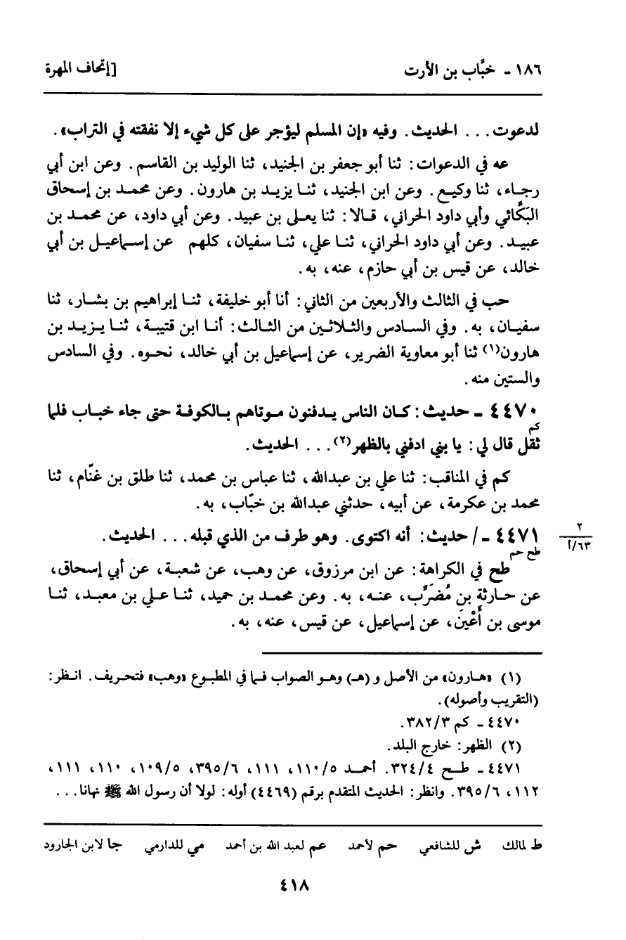 -[419]- أَحْمَدُ: عَنْ مُحَمَّدِ بْنِ جَعْفَرٍ، عَنْ شُعْبَةَ. وَعَنْ يَحْيَى بْنِ آدَمَ، عَنْ إِسْرَائِيلَ. وَعَنْ أَسْوَدَ بْنِ عَامِرٍ، عَنْ شَرِيكٍ، ثَلاثَتُهُمْ عَنْ أَبِي إِسْحَاقَ، عَنْ حَارِثَةَ بْنِ مُضَرِّبٍ، بِلَفْظِ: دَخَلْتُ عَلَى خَبَّابٍ وَقَدِ اكْتَوَى، فَقَالَ: مَا أَعْلَمُ أَحَدًا لَقِيَ مِنَ الْبَلاءِ مَا لَقِيتُ. . . الْحَدِيثَ فِي النَّهْيِ عَنْ تَمَنِّي الْمَوْتِ، وَلَيْسَ فِي حَدِيثِ شَرِيكٍ الْقِصَّةُ الأُولَى. وَفِي حَدِيثِ إِسْرَائِيلَ مِنَ الزِّيَادَةِ: ثُمَّ أُتِيَ بِكَفَنِهِ فَبَكَى، ثُمَّ قَالَ: لَكَنَّ حَمْزَةَ لَمْ يُوجَدْ لَهُ كَفَنٌ. . . الْحَدِيثَ. وَعَنْ يَزِيدَ، وَمُحَمَّدِ بْنِ يَزِيدَ، وَيَحْيَى بْنِ سَعِيدٍ، وَوَكِيعٍ، أَرْبَعَتُهُمْ عَنْ إِسْمَاعِيلَ بْنِ أَبِي خَالِدٍ، عَنْ قَيْسِ بْنِ أَبِي حَازِمٍ، عَنْهُ، بِهِ. وَفِي حَدِيثِ مُحَمَّدٍ وَيَزِيدَ زِيَادَةٌ تَأْتِي.