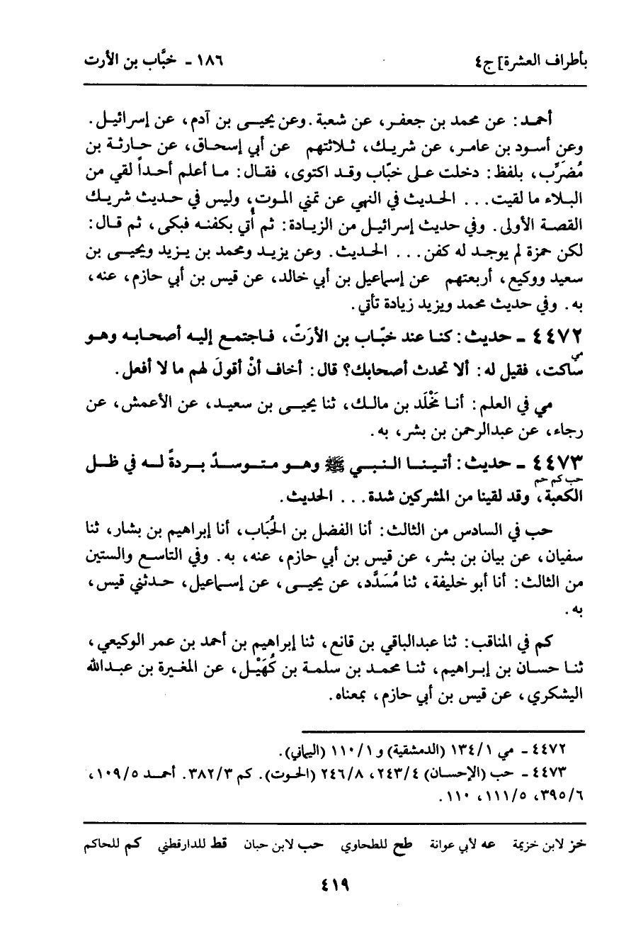 4473 - حَدِيثٌ (حب كم حم) : " أَتَيْنَا النَّبِيَّ صَلَّى اللَّهُ عَلَيْهِ وَسَلَّمَ وَهُوَ مُتَوَسِّدٌ بُرْدَةً لَهُ فِي ظِلِّ الْكَعْبَةِ، وَقَدْ لَقِينَا مِنَ الْمُشْرِكِينَ شِدَّةً. . . " , الْحَدِيثَ. حب فِي السَّادِسِ مِنَ الثَّالِثِ: أنا الْفَضْلُ بْنُ الْحُبَابِ، أنا إِبْرَاهِيمُ بْنُ بَشَّارٍ، ثنا سُفْيَانُ، عَنْ بَيَانِ بْنِ بِشْرٍ، عَنْ قَيْسِ بْنِ أَبِي حَازِمٍ، عَنْهُ، بِهِ. وَفِي التَّاسِعِ وَالسِّتِّينَ مِنَ الثَّالِثِ: أنا أَبُو خَلِيفَةَ، ثنا مُسَدَّدٌ، عَنْ يَحْيَى، عَنْ إِسْمَاعِيلَ، حَدَّثَنِي قَيْسٌ، بِهِ. كم فِي الْمَنَاقِبِ: ثنا عَبْدُ الْبَاقِي بْنُ قَانِعٍ، ثنا إِبْرَاهِيمُ بْنُ أَحْمَدَ بْنِ عُمَرَ الْوَكِيعِيُّ، ثنا حَسَّانُ بْنُ إِبْرَاهِيمَ، ثنا مُحَمَّدُ بْنُ سَلَمَةَ بْنِ كُهَيْلٍ، عَنِ الْمُغِيرَةِ بْنِ عَبْدِ اللَّهِ الْيَشْكُرِيِّ، عَنْ قَيْسِ بْنِ أَبِي حَازِمٍ، بِمَعْنَاهُ.