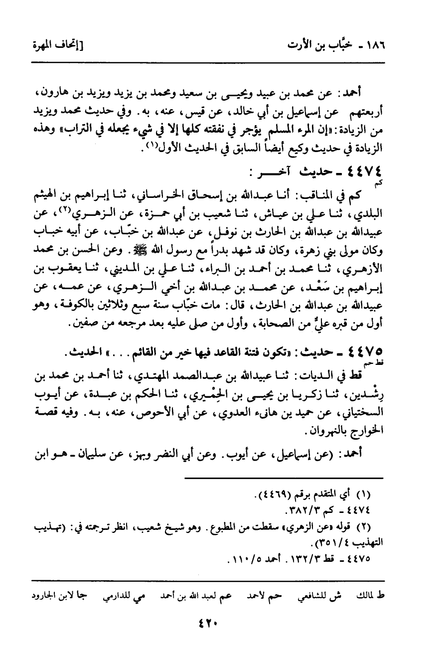4475 - حَدِيثٌ (قط حم) : " تَكُونُ فِتْنَةٌ الْقَاعِدُ فِيهَا خَيْرٌ مِنَ الْقَائِمِ. . . " الْحَدِيثَ. قط فِي الدِّيَاتِ: ثنا عُبَيْدُ اللَّهِ بْنُ عَبْدِ الصَّمَدِ الْمُهْتَدِي، ثنا أَحْمَدُ بْنُ مُحَمَّدِ بْنِ رِشْدِينَ، ثنا زَكَرِيَّا بْنُ يَحْيَى بْنِ الْحِمْيَرِيِّ، ثنا الْحَكَمُ بْنُ عَبْدَةَ، عَنْ أَيُّوبَ السِّخْتِيَانِيِّ، عَنْ حُمَيْدِ بْنِ هَانِئٍ الْعَدَوِيِّ، عَنْ أَبِي الأَحْوَصِ، عَنْهُ، بِهِ. وَفِيهِ قِصَّةُ الْخَوَارِجِ بِالنَّهْرَوَانِ. أَحْمَدُ: عَنْ إِسْمَاعِيلَ، عَنْ أَيُّوبَ. وَعَنْ أَبِي النَّضْرِ، وَبَهْزٍ، عَنْ سُلَيْمَانَ هُوَ ابْنُ