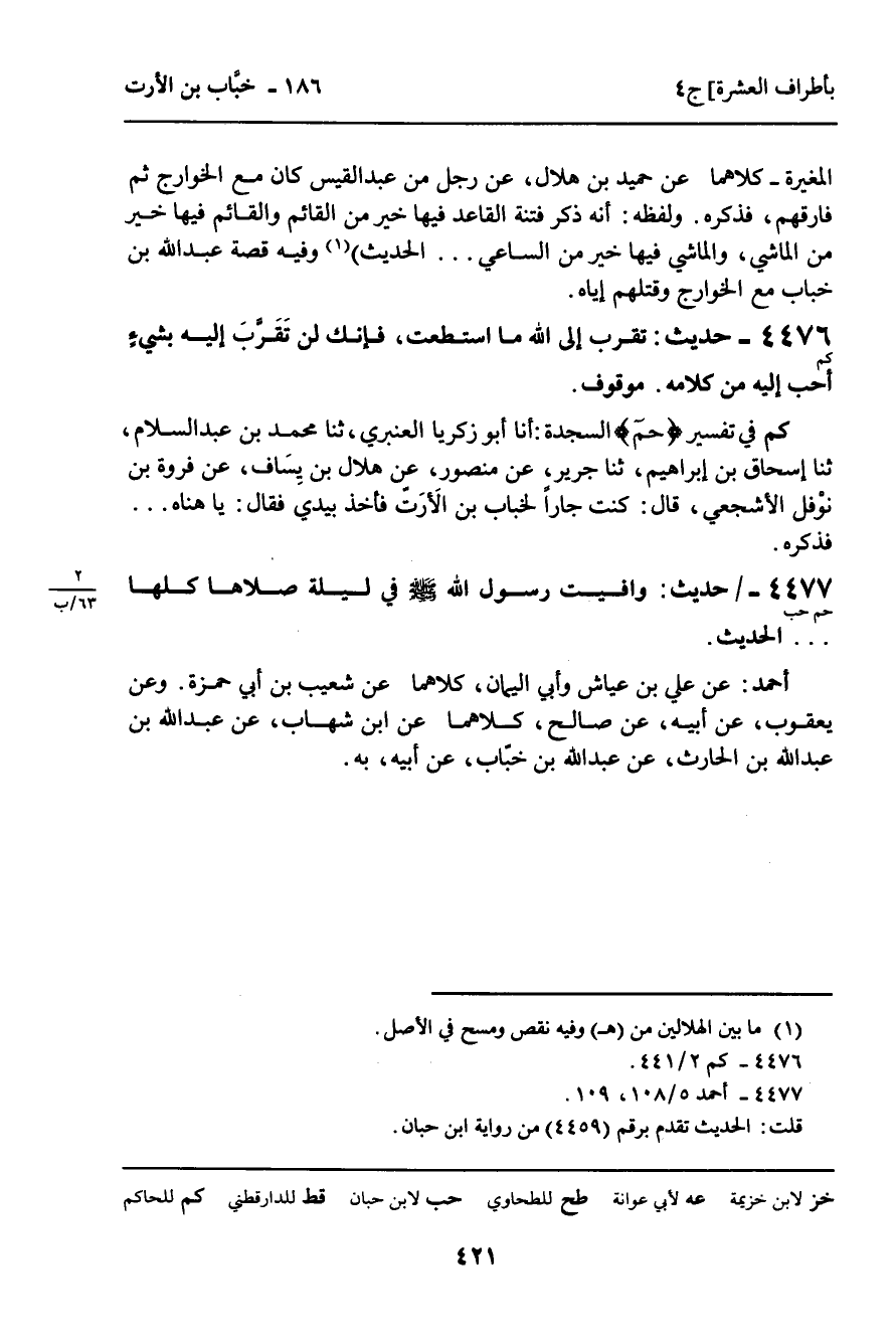 4477 - حَدِيثٌ (حم حب) : " وَافَيْتُ رَسُولَ اللَّهِ صَلَّى اللَّهُ عَلَيْهِ وَسَلَّمَ فِي لَيْلَةٍ صَلاهَا كُلَّهَا. . . " الْحَدِيثَ. أَحْمَدُ: عَنْ عَلِيِّ بْنِ عَيَّاشٍ، وَأَبِي الْيَمَانِ، كِلاهُمَا عَنْ شُعَيْبِ بْنِ أَبِي حَمْزَةَ. وَعَنْ يَعْقُوبَ، عَنْ أَبِيهِ، عَنْ صَالِحٍ، كِلاهُمَا عَنِ ابْنِ شِهَابٍ، عَنْ عَبْدِ اللَّهِ بْنِ عَبْدِ اللَّهِ بْنِ الْحَارِثِ، عَنْ عَبْدِ اللَّهِ بْنِ خَبَّابٍ، عَنْ أَبِيهِ، بِهِ.