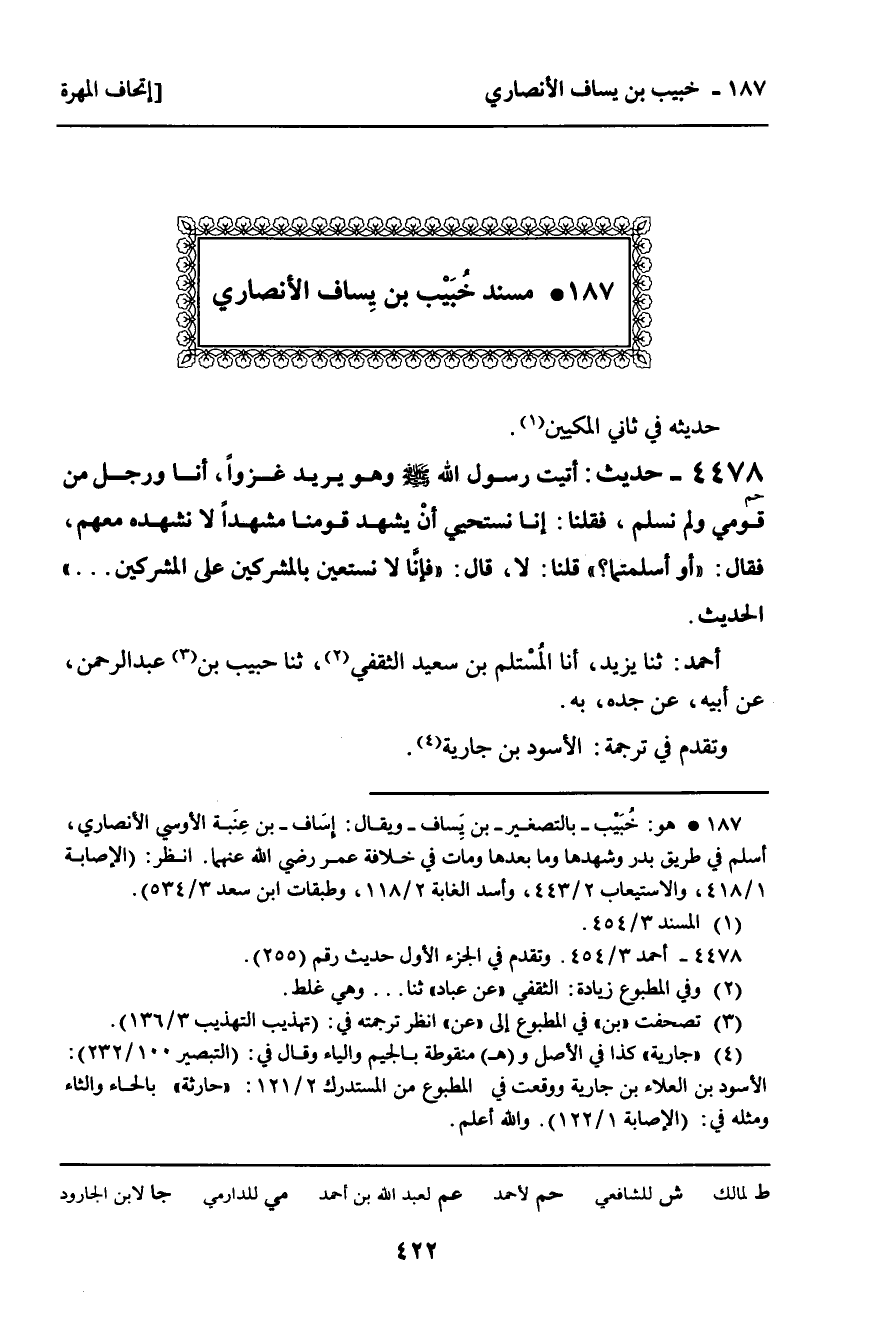 4478 - حَدِيثٌ (حم) أَتَيْتُ رَسُولَ اللَّهِ صَلَّى اللَّهُ عَلَيْهِ وَسَلَّمَ وَهُوَ يُرِيدُ غَزْوًا، أَنَا وَرَجُلٌ مِنْ قَوْمِي وَلَمْ نُسْلِمْ، فَقُلْنَا: إِنَّا نَسْتَحِي أَنْ يَشْهَدَ قَوْمُنَا مَشْهَدًا لا نَشْهَدُهُ مَعَهُمْ، فَقَالَ: " أَوَ أَسْلَمْتُمَا؟ " قُلْنَا: لا، قَالَ: " فَإِنَّا لا نَسْتَعِينُ بِالْمُشْرِكِينَ عَلَى الْمُشْرِكِينَ. . . " الْحَدِيثَ. أَحْمَدُ: ثنا يَزِيدُ، أنا الْمُسْتَلِمُ بْنُ سَعِيدٍ الثَّقَفِيُّ، ثنا حَبِيبُ بْنُ عَبْدِ الرَّحْمَنِ، عَنْ أَبِيهِ، عَنْ جَدِّهِ، بِهِ. وَتَقَدَّمَ فِي تَرْجَمَةِ: الأَسْوَدِ بْنِ جَارِيَةَ.
