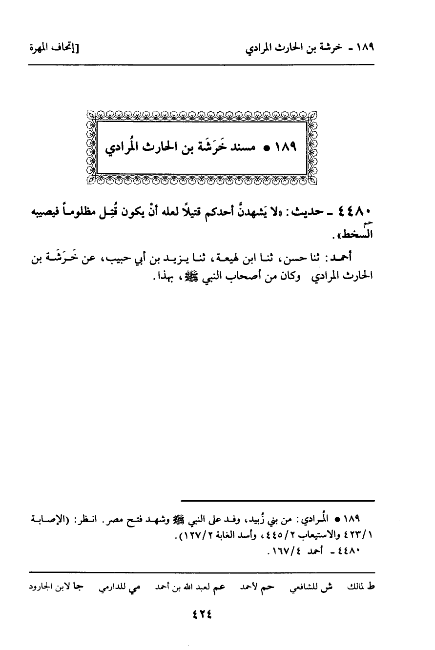 189 ـ مُسْنَدُ خَرْشَةَ بْنِ الْحَارِثِ الْمُرَادِيِّ