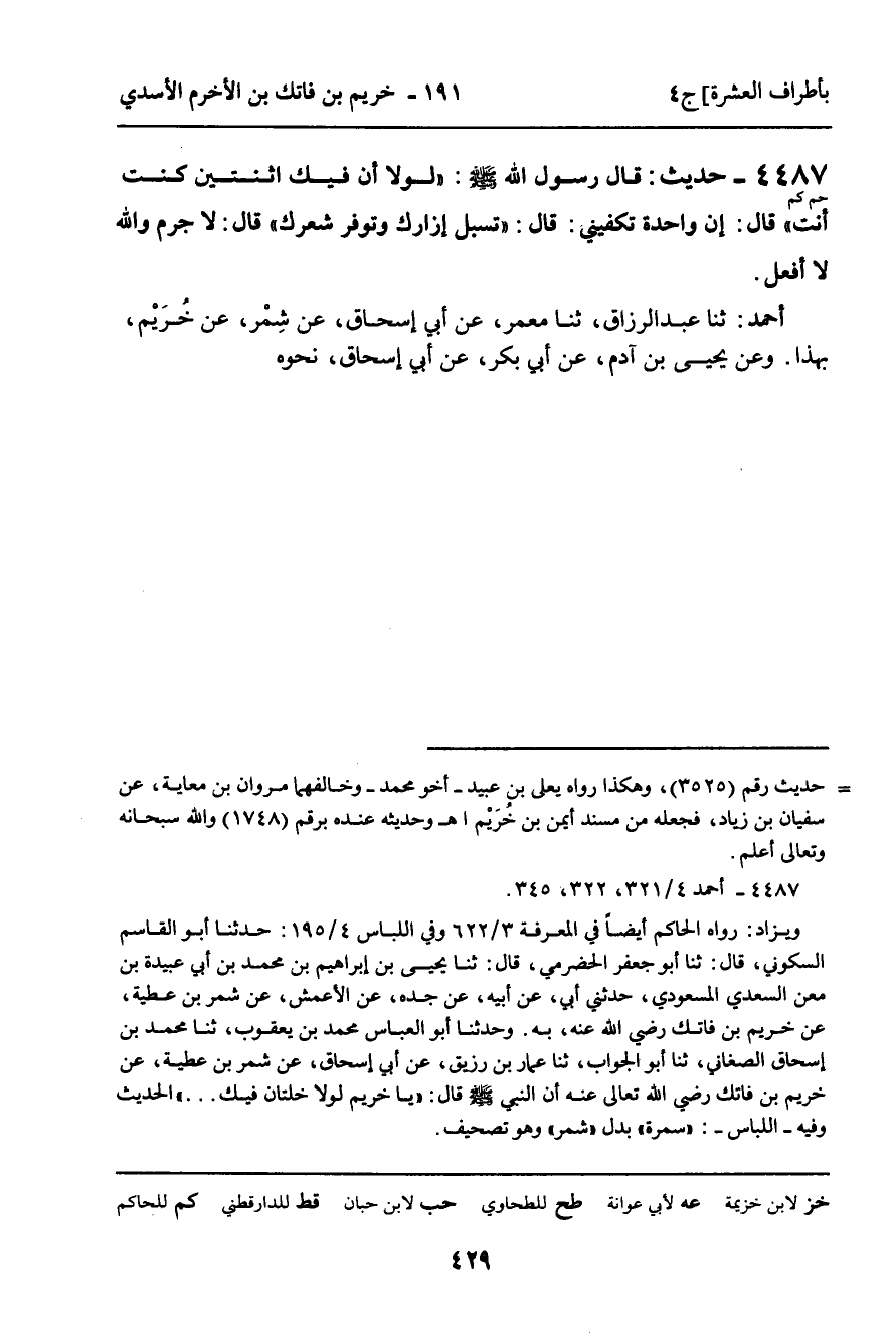 4487 - حَدِيثٌ (حم كم) : " قَالَ رَسُولُ اللَّهِ صَلَّى اللَّهُ عَلَيْهِ وَسَلَّمَ " لَوْلا أَنَّ فِيكَ اثْنَتَيْنِ كُنْتَ أَنْتَ " قَالَ: إِنَّ وَاحِدَةً تَكْفِينِي: قَالَ: " تُسْبِلُ إِزَارَكَ وَتُوَفِّرُ شَعْرَكَ " قَالَ: لا جَرَمَ وَاللَّهِ لا أَفْعَلُ " الْحَدِيثَ. أَحْمَدُ: ثنا عَبْدُ الرَّزَّاقِ، ثنا مَعْمَرٌ، عَنْ أَبِي إِسْحَاقَ، عَنْ شِمْرٍ، عَنْ خُرَيْمٍ، بِهَذَا. وَعَنْ يَحْيَى بْنِ آدَمَ، عَنْ أَبِي بَكْرٍ، عَنْ أَبِي إِسْحَاقَ، نَحْوَهُ.