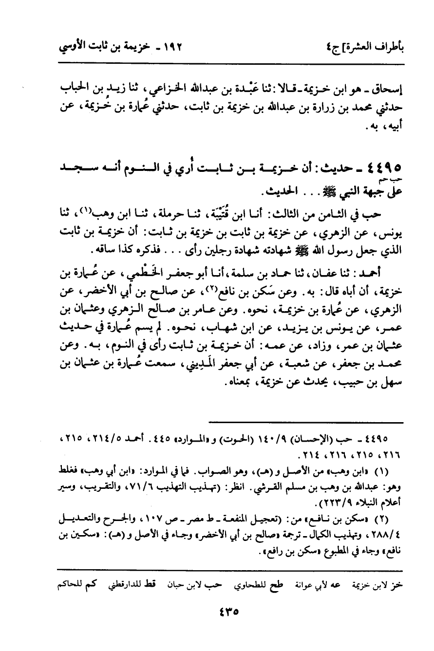 4495 - حَدِيثٌ (حب حم) : " أَنَّ خُزَيْمَةَ بْنَ ثَابِتٍ أُرِيَ فِي النَّوْمِ أَنَّهُ سَجَدَ عَلَى جَبْهَةِ النَّبِيِّ صَلَّى اللَّهُ عَلَيْهِ وَسَلَّمَ. . . " الْحَدِيثَ. حب فِي الثَّامِنِ مِنَ الثَّالِثِ: أنا ابْنُ قُتَيْبَةَ، ثنا حَرْمَلَةُ، ثنا ابْنُ وَهْبٍ، ثنا يُونُسُ، عَنِ الزُّهْرِيِّ، عَنْ خُزَيْمَةَ بْنِ ثَابِتٍ: أَنَّ خُزَيْمَةَ بْنَ ثَابِتٍ الَّذِي جَعَلَ رَسُولُ اللَّهِ صَلَّى اللَّهُ عَلَيْهِ وَسَلَّمَ شَهَادَتَهُ شَهَادَةَ رَجُلَيْنِ رَأَى. . . فَذَكَرَهُ كَذَا سَاقَهُ. أَحْمَدُ: ثنا عَفَّانُ، ثنا حَمَّادُ بْنُ سَلَمَةَ، أنا أَبُو جَعْفَرٍ الْخَطْمِيُّ، عَنْ عُمَارَةَ بْنِ خُزَيْمَةَ، أَنَّ أَبَاهُ قَالَ: بِهِ. وَعَنْ سَكَنِ بْنِ نَافِعٍ، عَنْ صَالِحِ بْنِ أَبِي الأَخْضَرِ، عَنِ الزُّهْرِيِّ، عَنْ عُمَارَةَ بْنِ خُزَيْمَةَ، نَحْوَهُ. وَعَنْ عَامِرِ بْنِ صَالِحٍ الزُّهْرِيِّ، وَعُثْمَانَ بْنِ عُمَرَ، عَنْ يُونُسَ بْنِ يَزِيدَ، عَنِ ابْنِ شِهَابٍ، نَحْوَهُ. لَمْ يُسِمِّ عُمَارَةَ فِي حَدِيثِ عُثْمَانَ بْنِ عُمَرَ، وَزَادَ، عَنْ عَمِّهِ: أَنَّ خُزَيْمَةَ بْنَ ثَابِتٍ رَأَى فِي النَّوْمِ، بِهِ. وَعَنْ مُحَمَّدِ بْنِ جَعْفَرٍ، عَنْ شُعْبَةَ، عَنْ أَبِي جَعْفَرٍ الْمَدِينِيِّ، سَمِعْتُ عُمَارَةَ بْنَ عُثْمَانَ بْنِ سَهْلِ بْنِ حَبِيبٍ، يُحَدِّثُ عَنْ خُزَيْمَةَ، بِمَعْنَاهُ.
