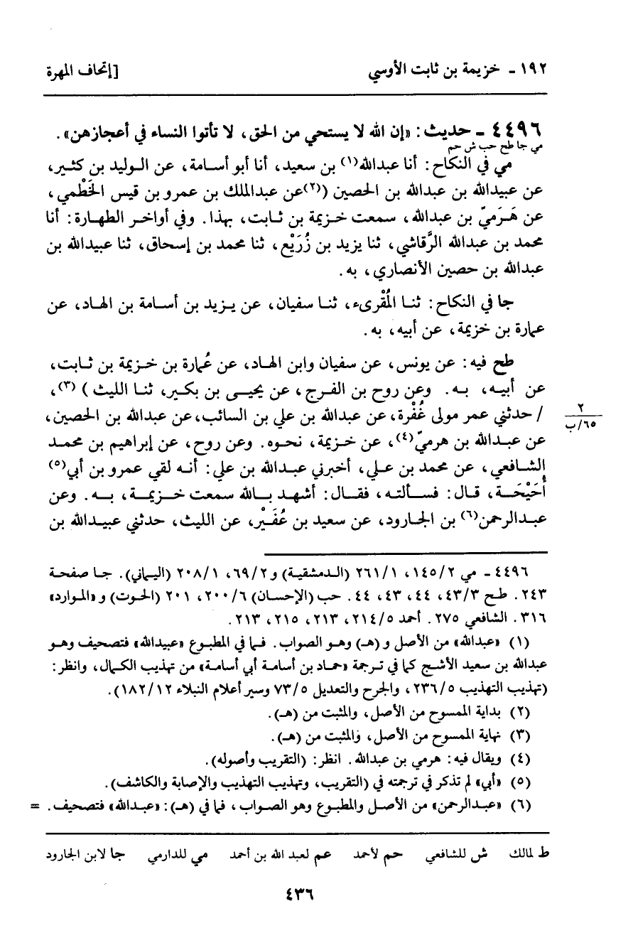 4496 - حَدِيثٌ (مي جا طح حب ش حم) : “ إِنَّ اللَّهَ لا يَسْتَحِي مِنَ الْحَقِّ، لا تَأْتُوا النِّسَاءَ فِي أَعْجَازِهِنَّ “. مي فِي النِّكَاحِ: أنا عَبْدُ اللَّهِ بْنُ سَعِيدٍ، أنا أَبُو أُسَامَةَ، عَنِ الْوَلِيدِ بْنِ كَثِيرٍ، عَنْ عُبَيْدِ اللَّهِ بْنِ عَبْدِ اللَّهِ بْنِ الْحُصَيْنِ، عَنْ عَبْدِ الْمَلِكِ بْنِ عَمْرِو بْنِ قَيْسٍ الْخَطْمِيِّ، عَنْ هَرَمِيِّ بْنِ عَبْدِ اللَّهِ، سَمِعْتُ خُزَيْمَةَ بْنَ ثَابِتٍ، بِهَذَا. وَفِي أَوَاخِرِ الطَّهَارَةِ: أنا مُحَمَّدُ بْنُ عَبْدِ اللَّهِ الرَّقَاشِيُّ، ثنا يَزِيدُ بْنُ زُرَيْعٍ، ثنا مُحَمَّدُ بْنُ إِسْحَاقَ، ثنا عَبْدُ اللَّهِ بْنُ عَبْدِ اللَّهِ بْنِ حُصَيْنٍ الأَنْصَارِيُّ، بِهِ. جا فِي النِّكَاحِ: ثنا الْمُقْرِئُ، ثنا سُفْيَانُ، عَنْ يَزِيدَ بْنِ أُسَامَةَ بْنِ الْهَادِ، عَنْ عُمَارَةَ بْنِ خُزَيْمَةَ، عَنْ أَبِيهِ، بِهِ. طح فِيهِ: عَنْ يُونُسَ، عَنْ سُفْيَانَ، وَابْنِ الْهَادِ، عَنْ عُمَارَةَ بْنِ خُزَيْمَةَ بْنِ ثَابِتٍ، عَنْ أَبِيهِ، بِهِ. وَعَنْ رَوْحِ بْنِ الْفَرَجِ، عَنْ يَحْيَى بْنِ بُكَيْرٍ، ثنا اللَّيْثُ، حَدَّثَنِي عُمَرُ مَوْلَى غَفْرَةَ، عَنْ عَبْدِ اللَّهِ بْنِ عَلِيِّ بْنِ السَّائِبِ، عَنْ عَبْدِ اللَّهِ بْنِ الْحُصَيْنِ، عَنْ عَبْدِ اللَّهِ بْنِ هَرَمِيٍّ، عَنْ خُزَيْمَةَ، نَحْوَهُ. وَعَنْ رَوْحٍ، عَنْ إِبْرَاهِيمَ بْنِ مُحَمَّدٍ الشَّافِعِيِّ، عَنْ مُحَمَّدِ بْنِ عَلِيٍّ، أَخْبَرَنِي عَبْدُ اللَّهِ بْنُ عَلِيٍّ: أَنَّهُ لَقِيَ عَمْرَو بْنَ أَبِي أُحَيْحَةَ، قَالَ: فَسَأَلْتُهُ، فَقَالَ: أَشْهَدُ بِاللَّهِ سَمِعْتُ خُزَيْمَةَ، بِهِ.