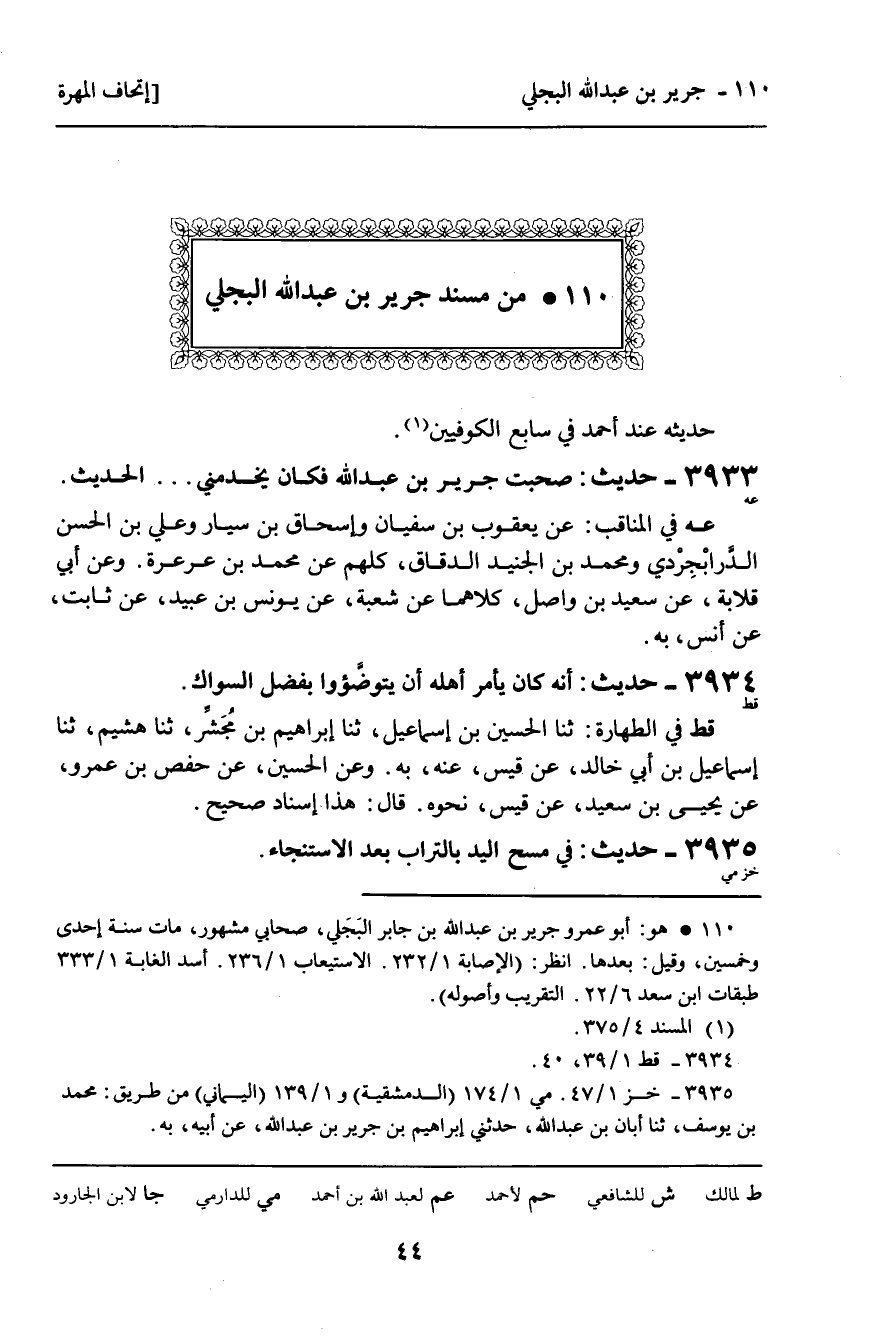3933 - حَدِيثٌ (عه) : " صَحِبْتُ جَرِيرَ بْنَ عَبْدِ اللَّهِ فَكَانَ يَخْدُمُنِي. . . الْحَدِيثَ.