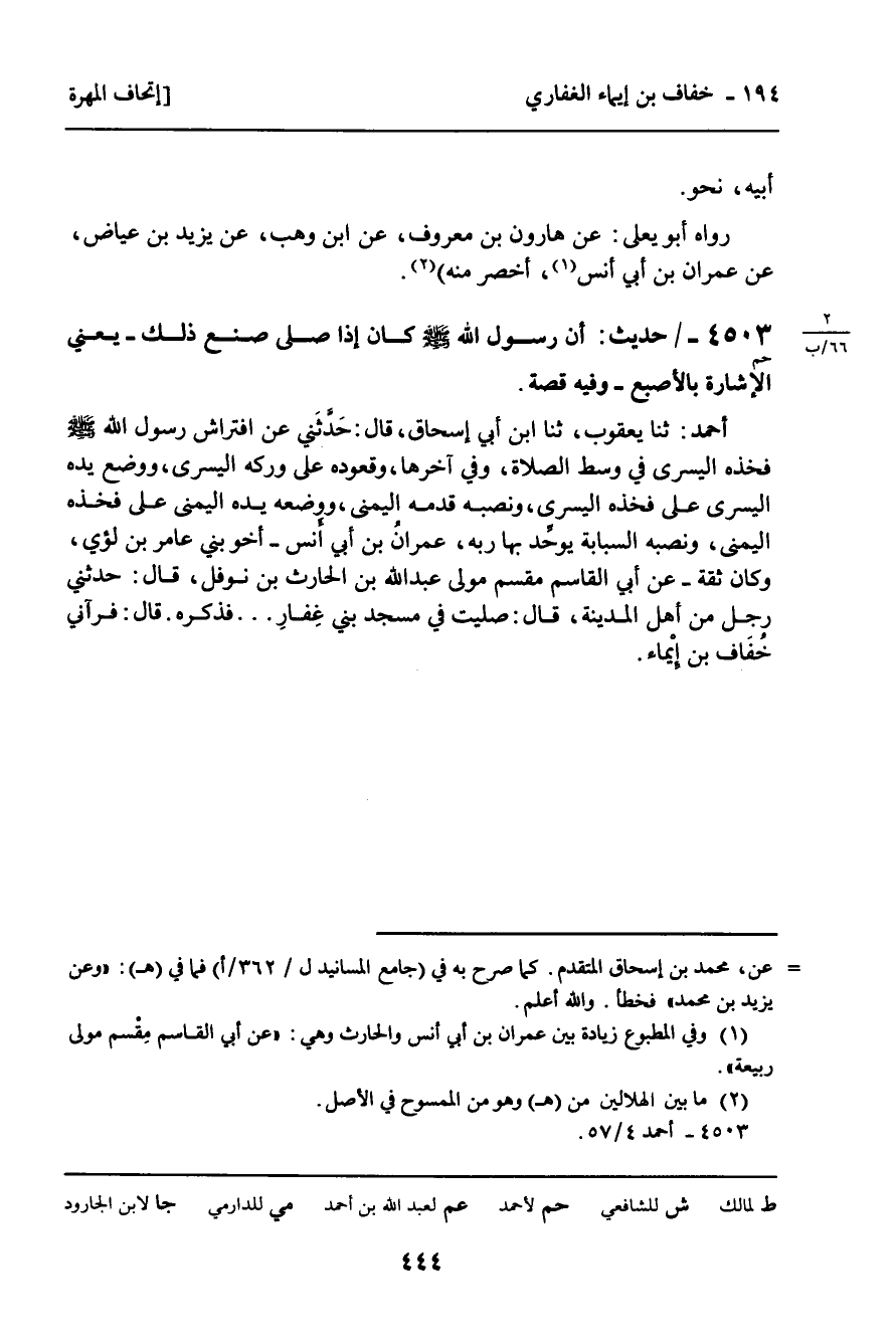 4503 - حَدِيثٌ (حم) : " أَنَّ رَسُولَ اللَّهِ صَلَّى اللَّهُ عَلَيْهِ وَسَلَّمَ كَانَ إِذَا صَلَّى صَنَعَ ذَلِكَ يَعْنِي: الإِشَارَةَ بِالأَصْبَعِ وَفِيهِ قِصَّةٌ. أَحْمَدُ: ثنا يَعْقُوبُ، ثنا ابْنُ أَبِي إِسْحَاقَ، قَالَ: حَدَّثَنِي عَنِ افْتِرَاشِ رَسُولِ اللَّهِ صَلَّى اللَّهُ عَلَيْهِ وَسَلَّمَ فَخِذَهُ الْيُسْرَى فِي وَسَطِ الصَّلاةِ، وَفِي آخِرِهَا، وَقُعُودِهِ عَلَى وَرْكِهِ الْيُسْرَى، وَوَضْعِ يَدِهِ الْيُسْرَى عَلَى فَخِذِهِ الْيُسْرَى، وَنَصْبِ قَدَمِهِ الْيُمْنَى، وَوَضْعِهِ يَدِهِ الْيُمْنَى عَلَى فَخِذِهِ الْيُمْنَى، وَنَصْبِهِ السَّبَّابَةِ يُوَحِّدُ بِهَا رَبَّهُ، عِمْرَانُ بْنُ أَنَسٍ أَخُو بَنِي عَامِرِ بْنِ لُؤَيٍّ وَكَانَ ثِقَةً، عَنْ أَبِي الْقَاسِمِ مِقْسَمٍ مَوْلَى عَبْدِ اللَّهِ بْنِ الْحَارِثِ بْنِ نَوْفَلٍ، قَالَ: حَدَّثَنِي رَجُلٌ مِنْ أَهْلِ الْمَدِينَةِ، قَالَ: صَلَّيْتُ فِي مَسْجِدِ بَنِي غِفَارٍ. . . فَذَكَرَهُ. قَالَ: فَرَآنِي خُفَافُ بْنُ إِيمَاءَ