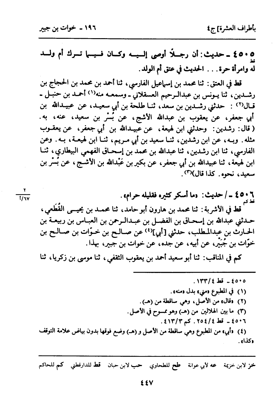 4505 - حَدِيثٌ (قط) : “ أَنَّ رَجُلا أَوْصَى إِلَيْهِ وَكَانَ فِيمَا تَرَكَ أُمُّ وَلَدٍ لَهُ وَامْرَأَةٌ حُرَّةٌ. . . “ الْحَدِيثَ فِي عِتْقِ أُمِّ الْوَلَدِ. قط فِي الْعِتْقِ: ثنا مُحَمَّدُ بْنُ إِسْمَاعِيلَ الْفَارِسِيُّ، ثنا أَحْمَدُ بْنُ مُحَمَّدِ بْنِ الْحَجَّاجِ بْنِ رِشْدِينَ، ثنا يُونُسُ بْنُ عَبْدِ الرَّحِيمِ الْعَسْقَلانِيُّ، وَسَمِعْتُهُ مِنْهُ أَحْمَدُ بْنُ حَنْبَلٍ، قَالَ: حَدَّثَنِي رِشْدِينُ بْنُ سَعْدٍ، ثنا طَلْحَةُ بْنُ أَبِي سَعِيدٍ، عَنْ عُبَيْدِ اللَّهِ بْنِ أَبِي جَعْفَرٍ، عَنْ يَعْقُوبَ بْنِ عَبْدِ اللَّهِ الأَشَجِّ، عَنْ بُسْرِ بْنِ سَعِيدٍ، عَنْهُ، بِهِ. قَالَ: رِشْدِينُ: وَحَدَّثَنِي ابْنُ لَهِيعَةَ، عَنْ عُبَيْدِ اللَّهِ بْنِ أَبِي جَعْفَرٍ، عَنْ يَعْقُوبَ مِثْلَهُ. وَبِهِ، عَنِ ابْنِ رِشْدِينَ، ثنا سَعِيدُ بْنُ أَبِي مَرْيَمَ، ثنا ابْنُ لَهِيعَةَ، بِهِ. وَعَنِ الْفَارِسِيِّ، ثنا ابْنُ رِشْدِينَ، ثنا عَبْدُ اللَّهِ بْنُ مُحَمَّدِ بْنِ إِسْحَاقَ الْفَهْمِيُّ الْبَيْطَارِيُّ، ثنا ابْنُ لَهِيعَةَ، ثنا عُبَيْدُ اللَّهِ بْنُ أَبِي جَعْفَرٍ، عَنْ بُكَيْرِ بْنِ عَبْدِ اللَّهِ بْنِ الأَشَجِّ، عَنْ بُسْرِ بْنِ سَعِيدٍ، نَحْوَهُ. كَذَا قَالَ.