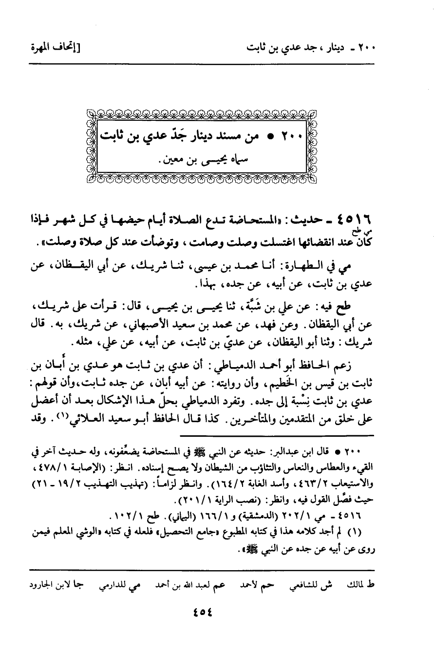 4516 - حَدِيثٌ (مي طح) : " الْمُسْتَحَاضَةُ تَدَعُ الصَّلاةَ أَيَّامَ حَيْضِهَا فِي كُلِّ شَهْرٍ فَإِذَا كَانَ عِنْدَ انْقِضَائِهَا اغْتَسَلَتْ وَصَلَّتْ وَصَامَتْ، وَتَوَضَّأَتْ عِنْدَ كُلِّ صَلاةٍ وَصَلَّتْ ". مي فِي الطَّهَارَةِ: أنا مُحَمَّدُ بْنُ عِيسَى، ثنا شَرِيكٌ، عَنْ أَبِي الْيَقْظَانِ، عَنْ عَدِيِّ بْنِ ثَابِتٍ، عَنْ أَبِيهِ، عَنْ جَدِّهِ، بِهَذَا. طح فِيهِ: عَنْ عَلِيِّ بْنِ شَبَّةَ، ثنا يَحْيَى بْنُ يَحْيَى، قَالَ: قَرَأْتُ عَلَى شَرِيكٍ، عَنْ أَبِي الْيَقْظَانِ. وَعَنْ فَهْدٍ، عَنْ مُحَمَّدِ بْنِ سَعِيدٍ الأَصْبَهَانِيِّ، عَنْ شَرِيكٍ، بِهِ. قَالَ شَرِيكٌ: وَثنا أَبُو الْيَقْظَانِ، عَنْ عَدِيِّ بْنِ ثَابِتٍ، عَنْ أَبِيهِ، عَنْ عَلِيٍّ، مِثْلَهُ. زَعَمَ الْحَافِظُ أَبُو أَحْمَدَ الدِّمْيَاطِيُّ: أَنَّ عَدِيَّ بْنَ ثَابِتٍ هُوَ عَدِيُّ بْنُ أَبَانِ بْنِ ثَابِتِ بْنِ قَيْسِ بْنِ الْخَطِيمِ، وَأَنَّ رِوَايَتَهُ: عَنْ أَبِيهِ أَبَانٍ، عَنْ جَدِّهِ ثَابِتٍ، وَأَنَّ قَوْلَهُمْ: عَدِيُّ بْنُ ثَابِتٍ نِسْبَةً إِلَى جَدِّهِ. وَتَفَرَّدَ الدِّمْيَاطِيُّ بِحَلِّ هَذَا الإِشْكَالِ بَعْدَ أَنْ أُعْضِلَ عَلَى خَلْقٍ مِنَ الْمُتَقَدِّمِينَ وَالْمُتَأَخِّرِينَ. كَذَا قَالَ الْحَافِظُ أَبُو سَعِيدٍ الْعَلائِيُّ. وَقَدْ