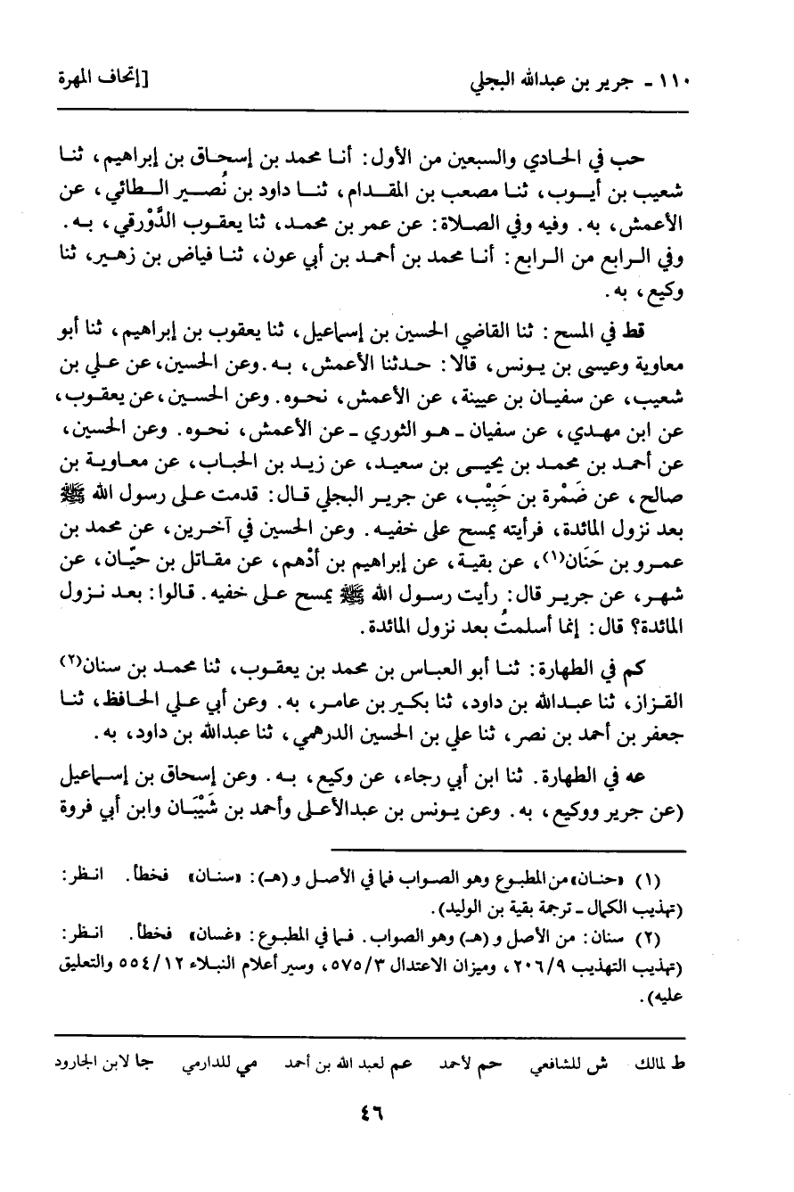 أَحْمَدُ: عَنْ أَبِي مُعَاوِيَةَ، وَسُفْيَانَ بْنِ عُيَيْنَةَ، كِلاهُمَا عَنِ الأَعْمَشِ. وَعَنْ عَفَّانَ، عَنْ أَبِي عَوَانَةَ. وَعَنْ مُحَمَّدِ بْنِ جَعْفَرٍ، وَمُحَمَّدِ بْنِ أَبِي عَدِيٍّ، عَنْ شُعْبَةَ، كِلاهُمَا عَنْ سُلَيْمَانَ هُوَ الأَعْمَشُ، عَنْ إِبْرَاهِيمَ، عَنْ هَمَّامِ بْنِ الْحَارِثِ، عَنْهُ، بِهِ. وَعَنْ أَسْوَدَ بْنِ عَامِرٍ، عَنْ شَرِيكٍ، عَنْ إِبْرَاهِيمَ بْنِ جَرِيرٍ، عَنْ قَيْسِ بْنِ أَبِي حَازِمٍ، عَنْهُ، بِمَعْنَاهُ. وَعَنْ هَاشِمِ بْنِ الْقَاسِمِ، عَنْ زِيَادِ بْنِ عَبْدِ اللَّهِ بْنِ عُلاثَةَ، عَنْ عَبْدِ الْكَرِيمِ بْنِ مَالِكٍ الْجَزَرِيِّ، عَنْ مُجَاهِدٍ، عَنْ جَرِيرٍ بِمَعْنَاهُ: أَنَا أَسْلَمْتُ بَعْدَمَا أُنْزِلَتْ سُورَةُ الْمَائِدَةِ، وَأَنَا رَأَيْتُ رَسُولَ اللَّهِ صَلَّى اللَّهُ عَلَيْهِ وَسَلَّمَ. . . .) .