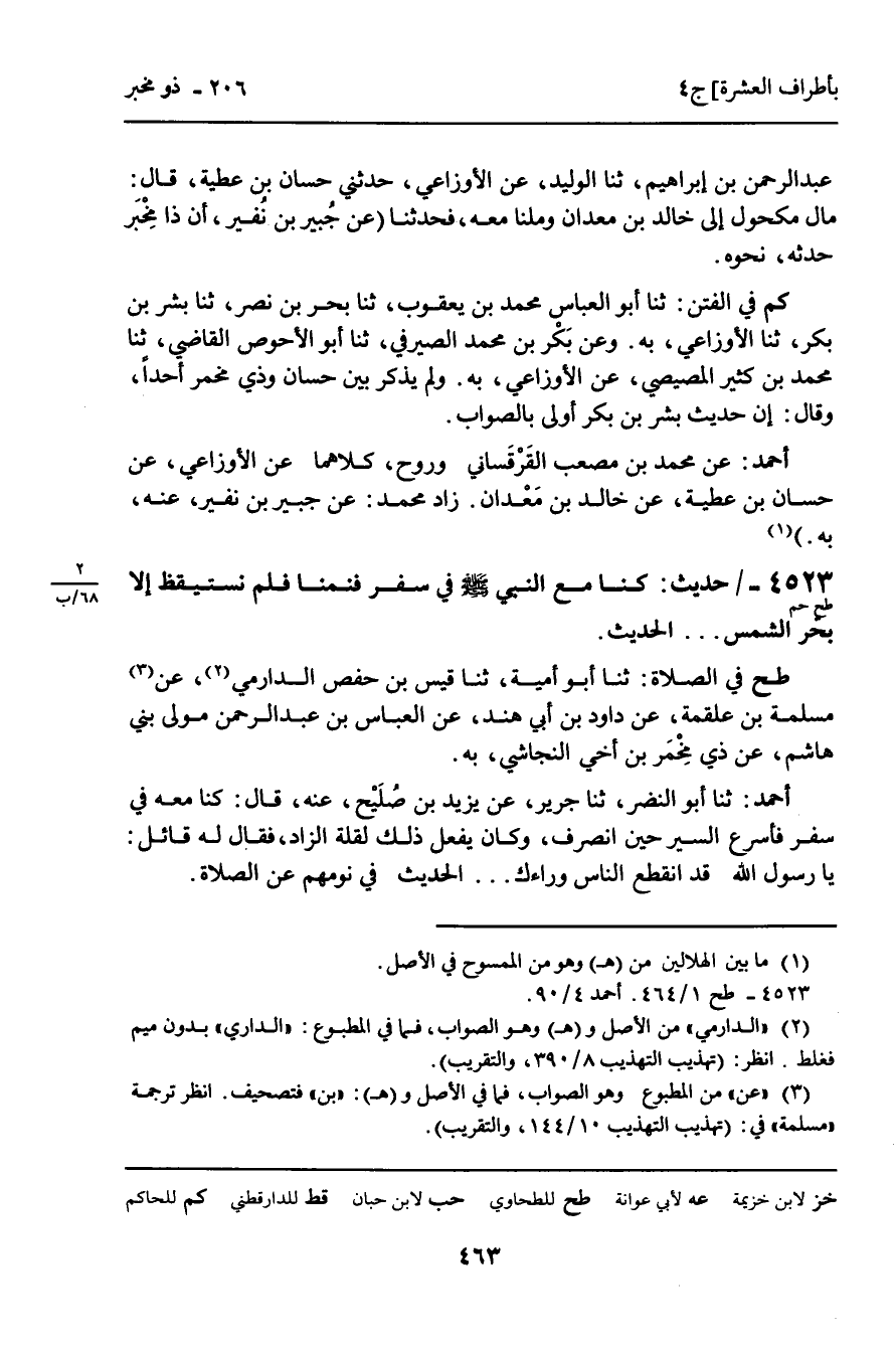 4523 - حَدِيثٌ (طح حم) : " كُنَّا مَعَ النَّبِيِّ صَلَّى اللَّهُ عَلَيْهِ وَسَلَّمَ فِي سَفَرٍ فَنِمْنَا فَلَمْ نَسْتَيْقِظْ إِلا بِحَرِّ الشَّمْسِ. . . " الْحَدِيثَ. طح فِي الصَّلاةِ: ثنا أَبُو أُمَيَّةَ، ثنا قَيْسُ بْنُ حَفْصٍ الدَّارِمِيُّ، عَنْ مُسْلِمِ بْنِ عَلْقَمَةَ، عَنْ دَاوُدَ بْنِ أَبِي هِنْدٍ، عَنِ الْعَبَّاسِ بْنِ عَبْدِ الرَّحْمَنِ مَوْلَى بَنِي هَاشِمٍ، عَنْ ذِي مِخْمَرٍ ابْنِ أَخِي النَّجَاشِيِّ، بِهِ. أَحْمَدُ: ثنا أَبُو النَّضْرِ، ثنا جَرِيرٌ، عَنْ يَزِيدَ بْنِ صُلَيْحٍ، عَنْهُ، قَالَ: كُنَّا مَعَهُ فِي سَفَرٍ فَأَسْرَعَ السَّيْرَ حِينَ انْصَرَفَ، وَكَانَ يَفْعَلُ ذَلِكَ لِقِلَّةِ الزَّادِ، فَقَالَ لَهُ قَائِلٌ: يَا رَسُولَ اللَّهِ قَدِ انْقَطَعَ النَّاسُ وَرَاءَكَ. . . الْحَدِيثَ فِي نَوْمِهِمْ عَنِ الصَّلاةِ.