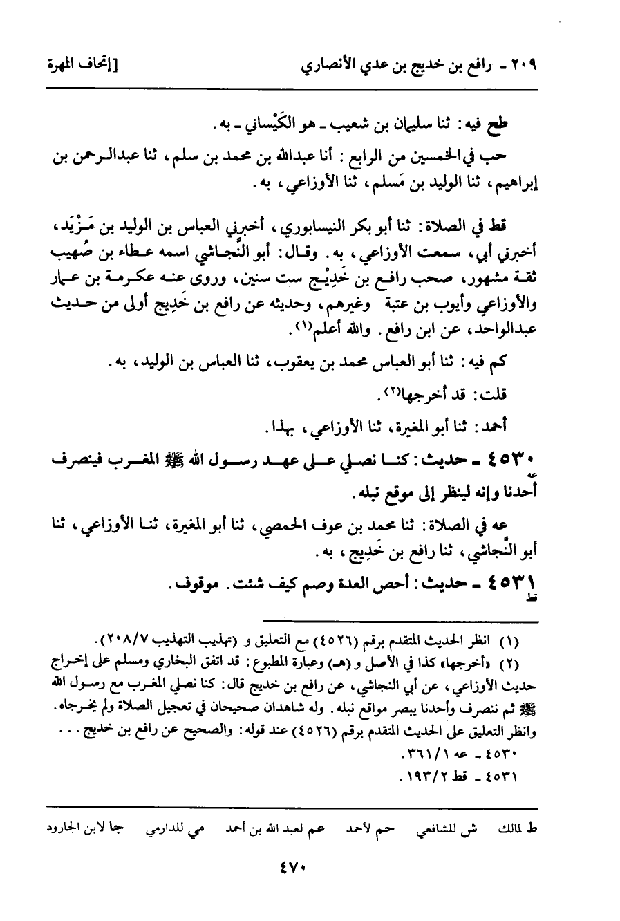4530 - حَدِيثٌ (عه) : " كُنَّا نُصَلِّي عَلَى عَهْدِ رَسُولِ اللَّهِ صَلَّى اللَّهُ عَلَيْهِ وَسَلَّمَ الْمَغْرِبَ فَيَنْصَرِفُ أَحَدُنَا وَإِنَّهُ لَيَنْظُرُ إِلَى مَوْقِعِ نَبْلِهِ ". عه فِي الصَّلاةِ: ثنا مُحَمَّدُ بْنُ عَوْفٍ الْحِمْصِيُّ، ثنا أَبُو الْمُغِيرَةِ، ثنا الأَوْزَاعِيُّ، ثنا أَبُو النَّجَاشِيِّ، ثنا رَافِعُ بْنُ خَدِيجٍ، بِهِ.