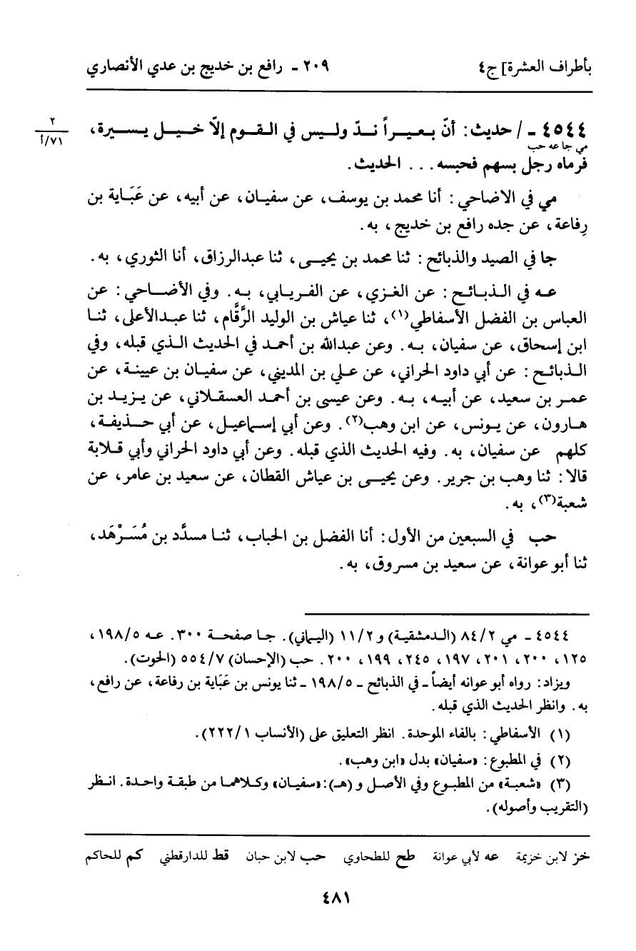 4544 - حَدِيثٌ (مي جا عه حب) : " أَنَّ بَعِيرًا نَدَّ وَلَيْسَ فِي الْقَوْمِ إِلا خَيْلٌ يَسِيرَةٌ، فَرَمَاهُ رَجُلٌ بِسَهْمٍ فَحَبَسَهُ. . . " الْحَدِيثَ. مي فِي الأَضَاحِي: أنا مُحَمَّدُ بْنُ يُوسُفَ، عَنْ سُفْيَانَ، عَنْ أَبِيهِ، عَنْ عَبَايَةَ بْنِ رِفَاعَةَ، عَنْ جَدِّهِ رَافِعِ بْنِ خَدِيجٍ، بِهِ. جا فِي الصَّيْدِ وَالذَّبَائِحِ: ثنا مُحَمَّدُ بْنُ يَحْيَى، ثنا عَبْدُ الرَّزَّاقِ، أنا الثَّوْرِيُّ، بِهِ. عه فِي الذَّبَائِحِ: عَنِ الْغَزِّيِّ، عَنِ الْفِرْيَابِيِّ، بِهِ. وَفِي الأَضَاحِي: عَنِ الْعَبَّاسِ بْنِ الْفَضْلِ الأَسْفَاطِيِّ، ثنا عَيَّاشُ بْنُ الْوَلِيدِ الرَّقَّامُ، ثنا عَبْدُ الأَعْلَى، ثنا ابْنُ إِسْحَاقَ، عَنْ سُفْيَانَ، بِهِ. وَعَنْ عَبْدِ اللَّهِ بْنِ أَحْمَدَ فِي الْحَدِيثِ الَّذِي قَبْلَهُ، وَفِي الذَّبَائِحِ: عَنْ أَبِي دَاوُدَ الْحَرَّانِيِّ، عَنْ عَلِيِّ بْنِ الْمَدِينِيِّ، عَنْ سُفْيَانَ بْنِ عُيَيْنَةَ، عَنْ عُمَرَ بْنِ سَعِيدٍ، عَنْ أَبِيهِ، بِهِ. وَعَنْ عِيسَى بْنِ أَحْمَدَ الْعَسْقَلانِيِّ، عَنْ يَزِيدَ بْنِ هَارُونَ، عَنْ يُونُسَ، عَنِ ابْنِ وَهْبٍ. وَعَنْ أَبِي إِسْمَاعِيلَ، عَنْ أَبِي حُذَيْفَةَ، كُلُّهُمْ عَنْ سُفْيَانَ، بِهِ. وَفِيهِ الْحَدِيثُ الَّذِي قَبْلَهُ. وَعَنْ أَبِي دَاوُدَ الْحَرَّانِيِّ، وَأَبِي قِلابَةَ قَالا: ثنا وَهْبُ بْنُ جَرِيرٍ. وَعَنْ يَحْيَى بْنِ عَيَّاشٍ الْقَطَّانِ، عَنْ سَعِيدِ بْنِ عَامِرٍ، عَنْ شُعْبَةَ، بِهِ.