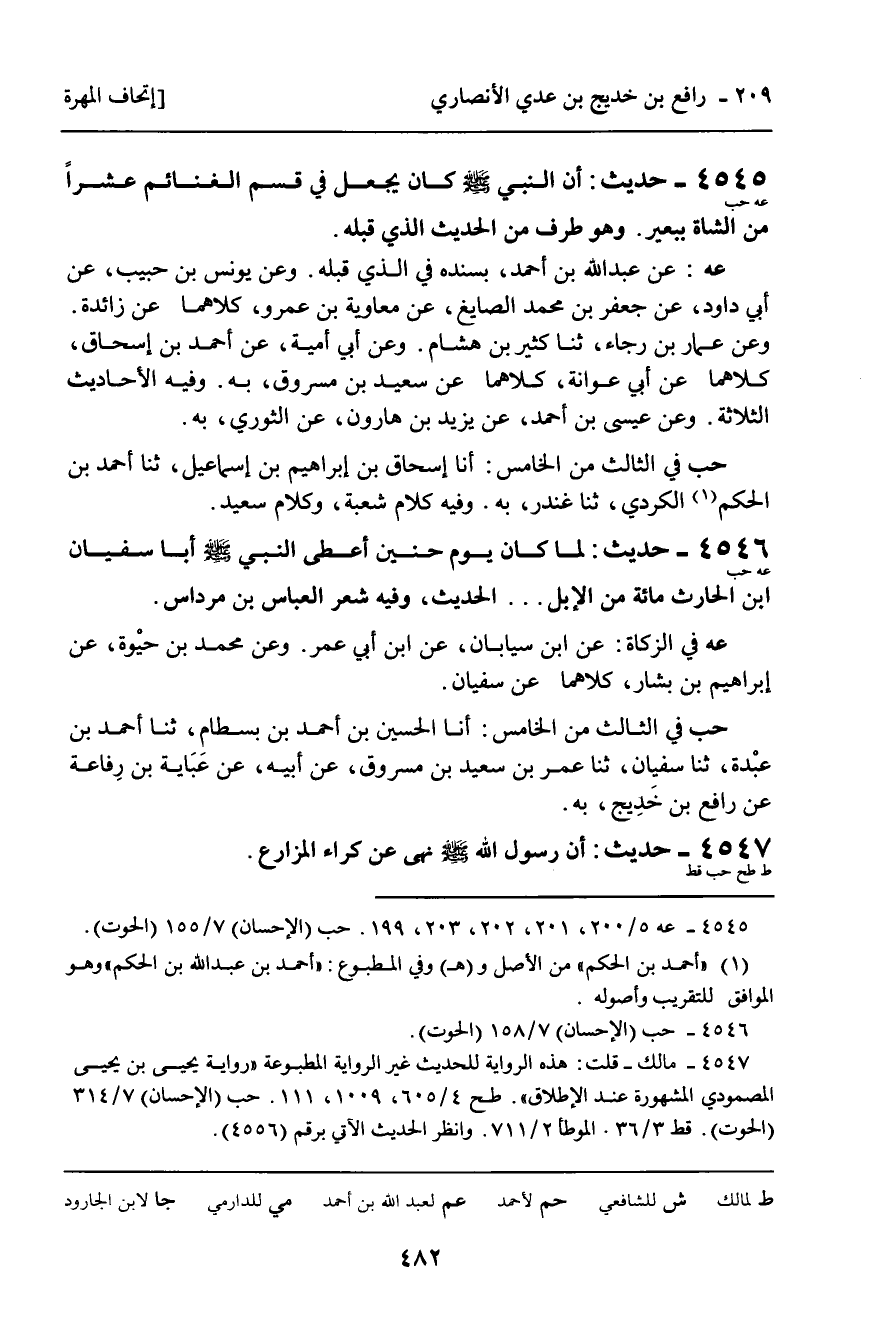 4546 - حَدِيثٌ (عه حب) : " لَمَّا كَانَ يَوْمَ حُنَيْنٍ أَعْطَى النَّبِيُّ صَلَّى اللَّهُ عَلَيْهِ وَسَلَّمَ أَبَا سُفْيَانَ بْنَ الْحَارِثَةَ مِائَةً مِنَ الإِبِلِ. . . " الْحَدِيثَ، وَفِيهِ شِعْرُ الْعَبَّاسِ بْنِ مِرْدَاسٍ. عه فِي الزَّكَاةِ: عَنِ ابْنِ سَيَابَانَ، عَنِ ابْنِ أَبِي عُمَرَ. وَعَنْ مُحَمَّدِ بْنِ حَيْوَةَ، عَنْ إِبْرَاهِيمَ بْنِ بَشَّارٍ، كِلاهُمَا عَنْ سُفْيَانَ. حب فِي الثَّالِثِ مِنَ الْخَامِسِ: أنا الْحُسَيْنُ بْنُ أَحْمَدَ بْنِ بِسْطَامٍ، ثنا أَحْمَدُ بْنُ عَبْدَةَ، ثنا سُفْيَانُ، ثنا عُمَرُ بْنُ سَعِيدِ بْنِ مَسْرُوقٍ، عَنْ أَبِيهِ، عَنْ عَبَايَةَ بْنِ رِفَاعَةَ، عَنْ رَافِعِ بْنِ خَدِيجٍ، بِهِ.
