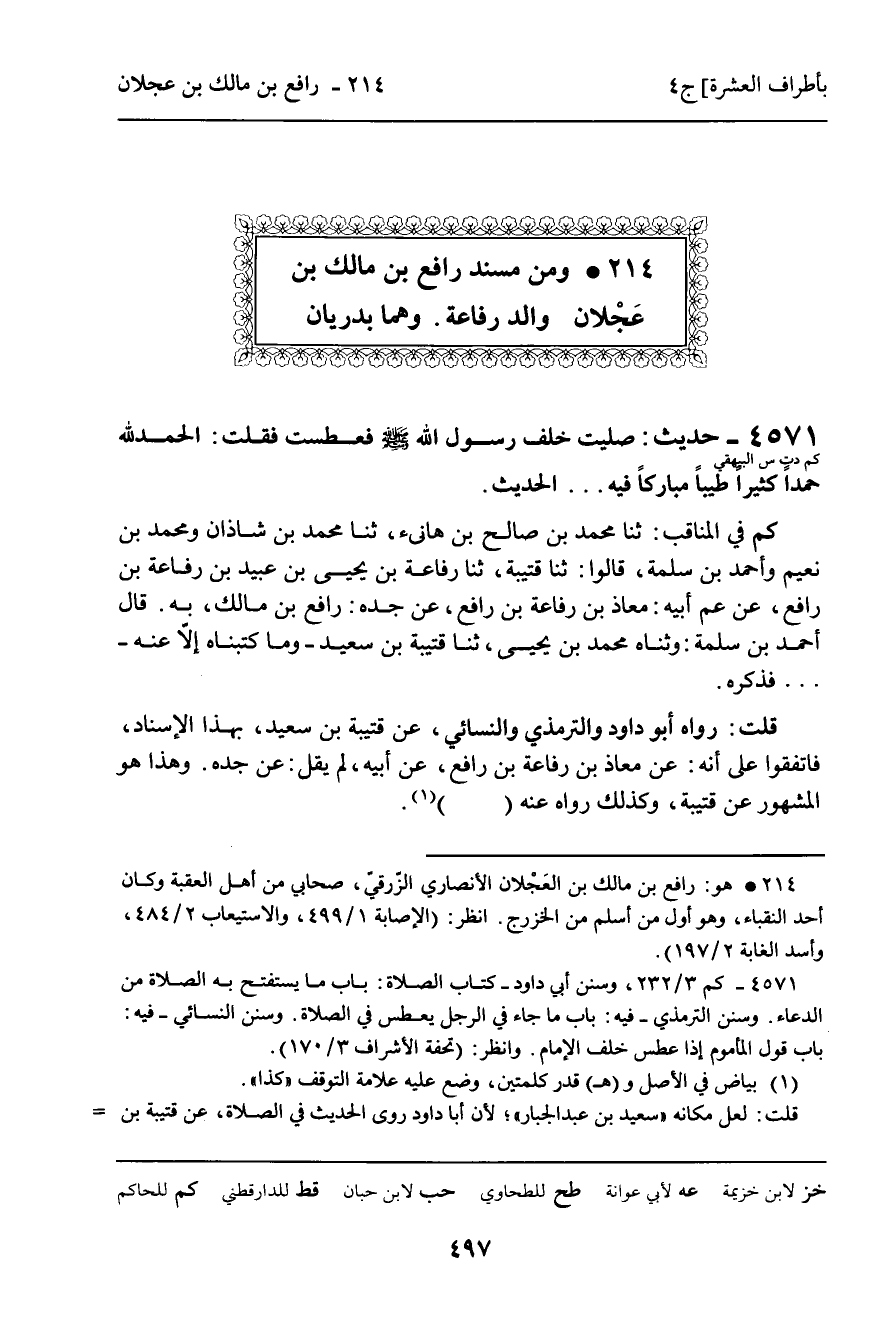 4571 - حَدِيثٌ (كم دت س البيهقي) : " صَلَّيْتُ خَلْفَ رَسُولِ اللَّهِ صَلَّى اللَّهُ عَلَيْهِ وَسَلَّمَ فَعَطَسْتُ فَقُلْتُ: الْحَمْدُ للَّهِ حَمْدًا كَثِيرًا مُبَارَكًا فِيهِ. . . " الْحَدِيثَ. كم فِي الْمَنَاقِبِ: ثنا مُحَمَّدُ بْنُ صَالِحِ بْنِ هَانِئٍ، ثنا مُحَمَّدُ بْنُ شَاذَانَ، وَمُحَمَّدُ بْنُ نُعَيْمٍ، وَأَحْمَدُ بْنُ سَلَمَةَ، قَالُوا: ثنا قُتَيْبَةُ، ثنا رِفَاعَةُ بْنُ يَحْيَى بْنِ عُبَيْدِ بْنِ رِفَاعَةَ بْنِ رَافِعٍ، عَنْ عَمِّ أَبِيهِ: مُعَاذِ بْنِ رِفَاعَةَ بْنِ رَافِعٍ، عَنْ جَدِّهِ: رَافِعِ بْنِ مَالِكٍ، بِهِ. قَالَ أَحْمَدُ بْنُ سَلَمَةَ: وثناه مُحَمَّدُ بْنُ يَحْيَى، ثنا قُتَيْبَةُ بْنُ سَعِيدٍ، وَمَا كَتَبْنَاهُ إِلا عَنْهُ. . . فَذَكَرَهُ. قُلْتُ: رَوَاهُ أَبُو دَاوُدَ، وَالتِّرْمِذِيُّ، وَالنَّسَائِيُّ، عَنْ قُتَيْبَةَ بْنِ سَعِيدٍ، بِهَذَا الإِسْنَادِ، فَاتَّفَقُوا عَلَى أَنَّهُ: مُعَاذُ بْنُ رِفَاعَةَ بْنِ رَافِعٍ، عَنْ أَبِيهِ، لَمْ يَقُلْ: عَنْ جَدِّهِ. وَهَذَا هُوَ الْمَشْهُورُ عَنْ قُتَيْبَةَ، وَكَذَلِكَ رَوَاهُ عَنْهُ () .