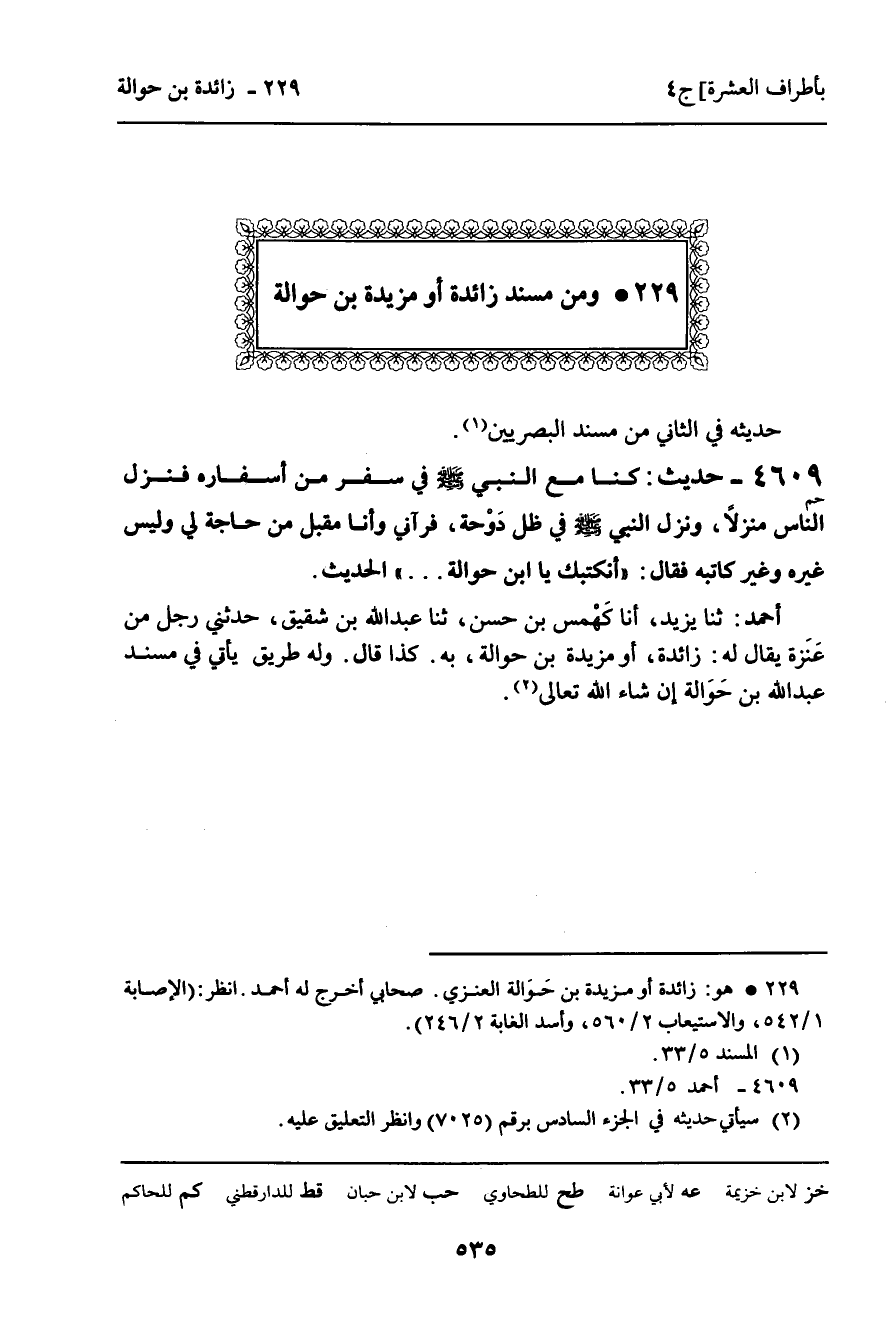 229 ـ وَمِنْ مُسْنَدِ زَائِدَةَ أَوْ مَزِيدَةَ بْنِ حَوَالَةَ