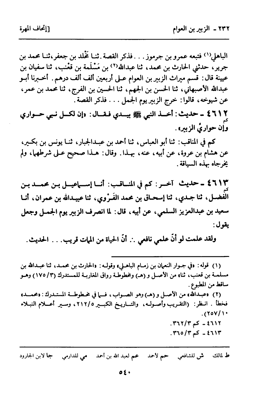 4613 - حَدِيثٌ آخَرَ (كم) فِي الْمَنَاقِبِ: " أنا إِسْمَاعِيلُ بْنُ مُحَمَّدِ بْنِ الْفَضْلِ، ثنا جَدِّي، ثنا إِسْحَاقُ بْنُ مُحَمَّدٍ الْفَرْوِيُّ، ثنا عُبَيْدُ اللَّهِ بْنُ عِمْرَانَ، أنا سَعِيدُ بْنُ عَبْدِ الْعَزِيزِ السُّلَمِيُّ، عَنْ أَبِيهِ، قَالَ: لَمَّا انْصَرَفَ الزُّبَيْرُ يَوْمَ الْجَمَلِ وَجَعَلَ يَقُولُ: