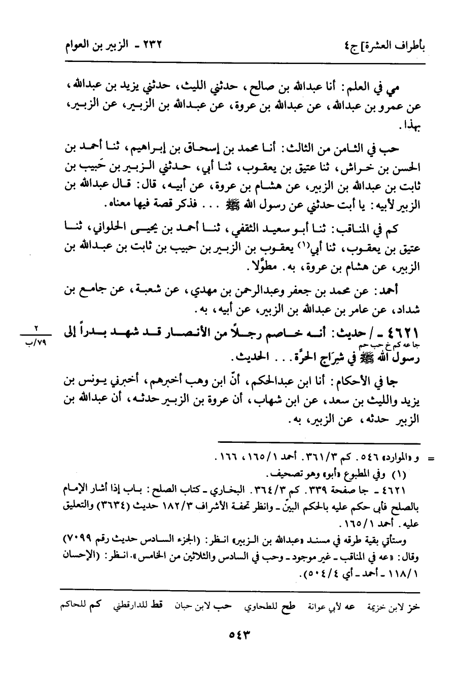 4621 - حَدِيثٌ (جا عه كم خ حب حم) : " أَنَّهُ خَاصَمَ رَجُلا مِنَ الأَنْصَارِ قَدْ شَهِدَ بَدْرًا إِلَى رَسُولِ اللَّهِ صَلَّى اللَّهُ عَلَيْهِ وَسَلَّمَ فِي شِرَاجِ الْحَرَّةِ. . . " الْحَدِيثَ. جا فِي الأَحْكَامِ: أنا ابْنُ عَبْدِ الْحَكَمِ، أَنَّ ابْنَ وَهْبٍ أَخْبَرَهُمْ، أَخْبَرَنِي يُونُسُ بْنُ يَزِيدَ، وَاللَّيْثُ بْنُ سَعْدٍ، عَنِ ابْنِ شِهَابٍ، أَنَّ عُرْوَةَ بْنَ الزُّبَيْرِ حَدَّثَهُ، أَنَّ عَبْدَ اللَّهِ بْنَ الزُّبَيْرِ حَدَّثَهُ، عَنِ الزُّبَيْرِ، بِهِ.
