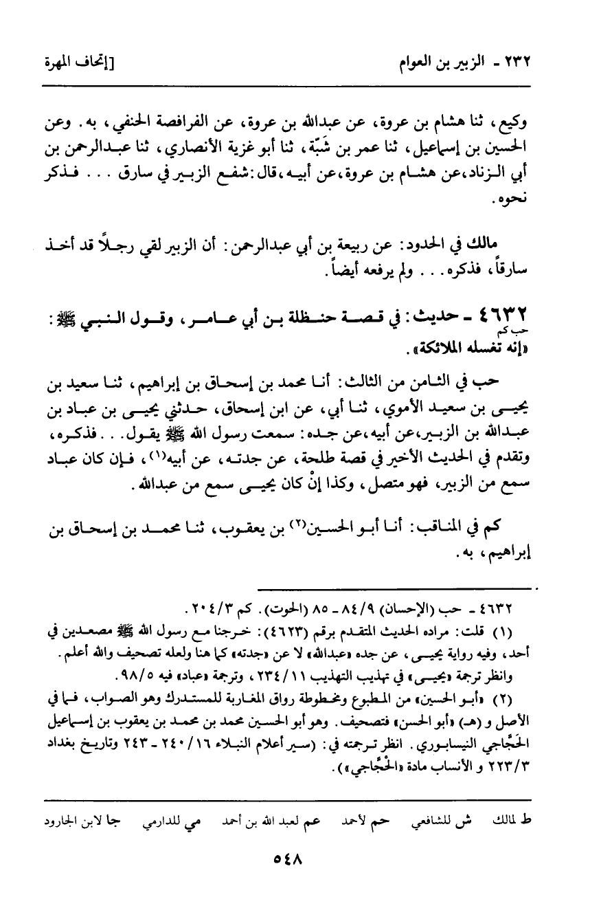 4632 - حَدِيثٌ (حب كم) : " فِي قِصَّةِ حَنْظَلَةَ بْنِ أَبِي عَامِرٍ، وَقَوْلِ النَّبِيِّ صَلَّى اللَّهُ عَلَيْهِ وَسَلَّمَ: " إِنَّهُ تُغَسِّلُهُ الْمَلائِكَةُ ". حب فِي الثَّامِنِ مِنَ الثَّالِثِ: أنا مُحَمَّدُ بْنُ إِسْحَاقَ بْنِ إِبْرَاهِيمَ، ثنا سَعِيدُ بْنُ يَحْيَى بْنِ سَعِيدٍ الأُمَوِيُّ، ثنا أَبِي، عَنِ ابْنِ إِسْحَاقَ، حَدَّثَنِي يَحْيَى بْنُ عَبَّادِ بْنِ عَبْدِ اللَّهِ بْنِ الزُّبَيْرِ، عَنْ أَبِيهِ، عَنْ جَدِّهِ: سَمِعْتُ رَسُولَ اللَّهِ صَلَّى اللَّهُ عَلَيْهِ وَسَلَّمَ يَقُولُ. . . فَذَكَرَهُ، وَتَقَدَّمَ فِي الْحَدِيثِ فِي قِصَّةِ طَلْحَةَ، عَنْ جَدَّتِهِ، عَنْ أَبِيهِ، فَإِنْ كَانَ عَبَّادٌ سَمِعَ مِنَ الزُّبَيْرِ، فَهُوَ مُتَّصِلٌ، وَكَذَا إِنْ كَانَ يَحْيَى سَمِعَ مِنْ عَبْدِ اللَّهِ. كم فِي الْمَنَاقِبِ: أنا أَبُو الْحُسَيْنِ بْنُ يَعْقُوبَ، ثنا مُحَمَّدُ بْنُ إِسْحَاقَ بْنِ إِبْرَاهِيمَ، بِهِ.