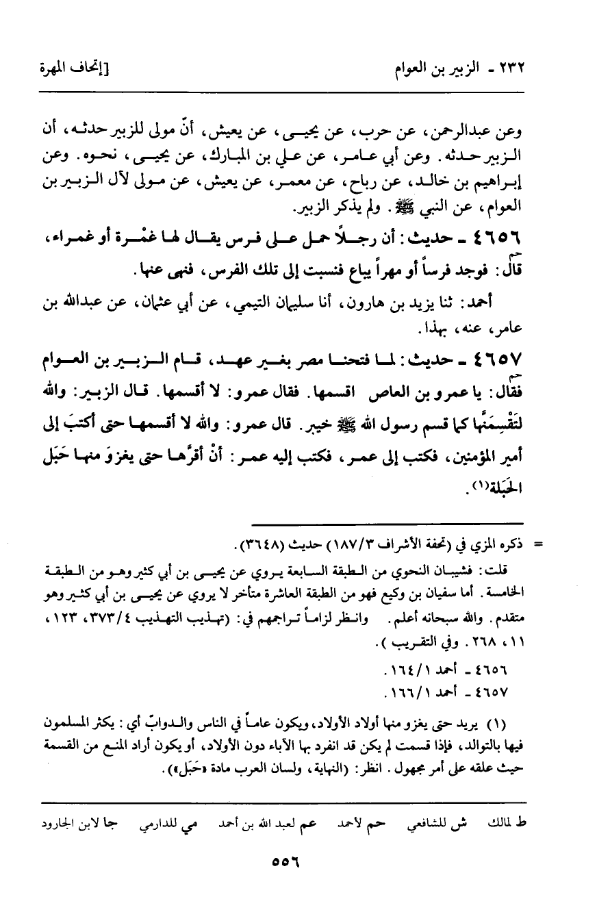 4657 - حَدِيثٌ (حم) : " لَمَّا فَتَحْنَا مِصْرَ بِغَيْرِ عَهْدٍ، قَامَ الزُّبَيْرُ بْنُ الْعَوَّامِ فَقَالَ: يَا عَمْرُو بْنُ الْعَاصِ اقْسِمْهَا. فَقَالَ عَمْرٌو: لا أَقْسِمُهَا. قَالَ الزُّبَيْرُ: وَاللَّهِ لَتَقْسِمَنَّهَا كَمَا قَسَمَ رَسُولُ اللَّهِ صَلَّى اللَّهُ عَلَيْهِ وَسَلَّمَ خَيْبَرَ. قَالَ عَمْرٌو: وَاللَّهِ لا أَقْسِمُهَا حَتَّى أَكْتُبَ إِلَى أَمِيرِ الْمُؤْمِنِينَ، فَكَتَبَ إِلَى عُمَرَ، فَكَتَبَ إِلَيْهِ عُمَرَ: أَنْ أُقِرَّهَا حَتَّى يَغْزُوَ مِنْهَا حَبَلُ الْحَبَلَةِ "