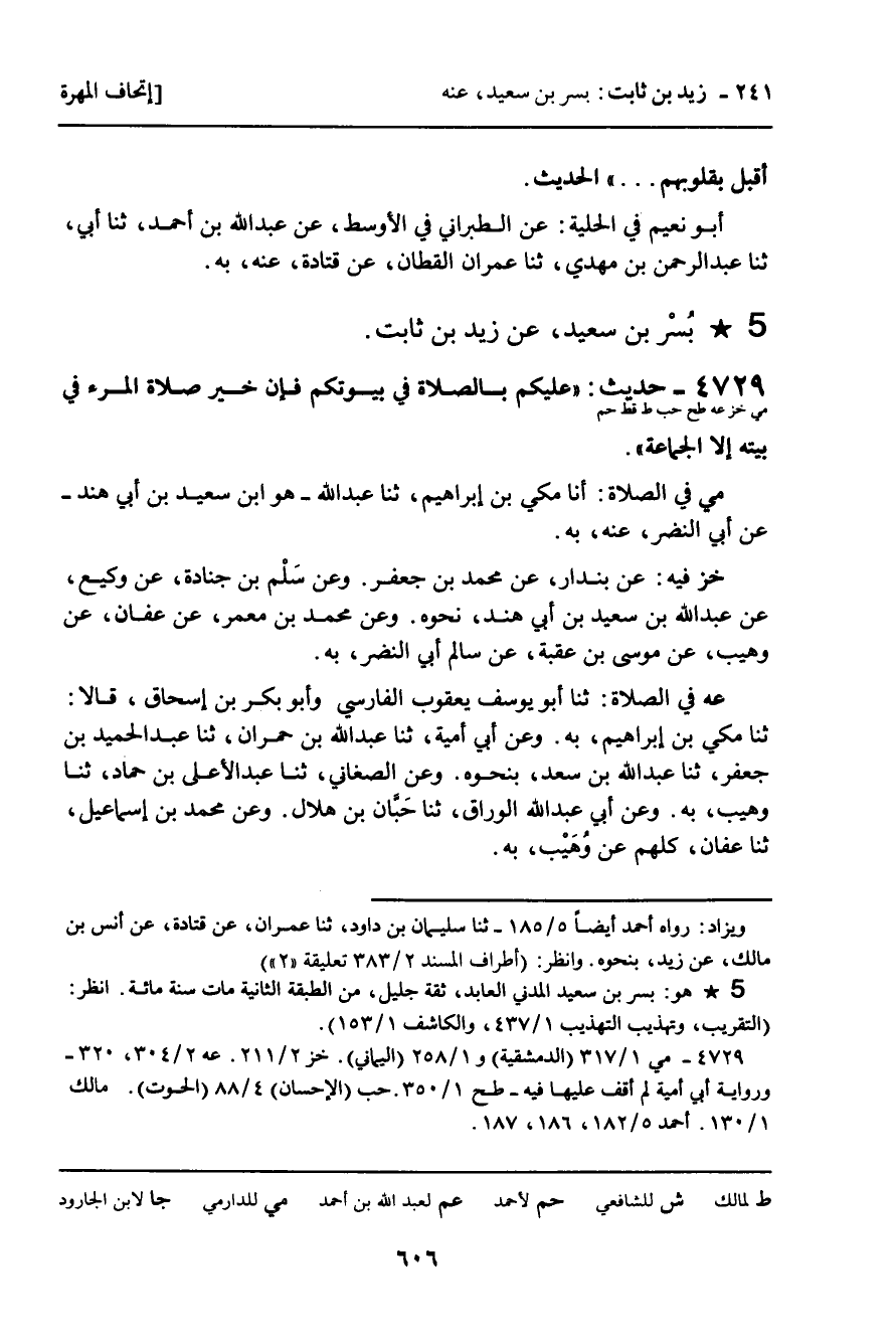 4729 - حَدِيثٌ (مي خز عه طح حب قط حم) : بُسْرُ بْنُ سَعِيدٍ، عَنْ زَيْدِ بْنِ ثَابِتٍ. " عَلَيْكُمْ بِالصَّلاةِ فِي بُيُوتِكُمْ فَإِنَّ خَيْرَ صَلاةِ الْمَرْءِ فِي بَيْتِهِ إِلا الْجَمَاعَةَ " الْحَدِيثَ.