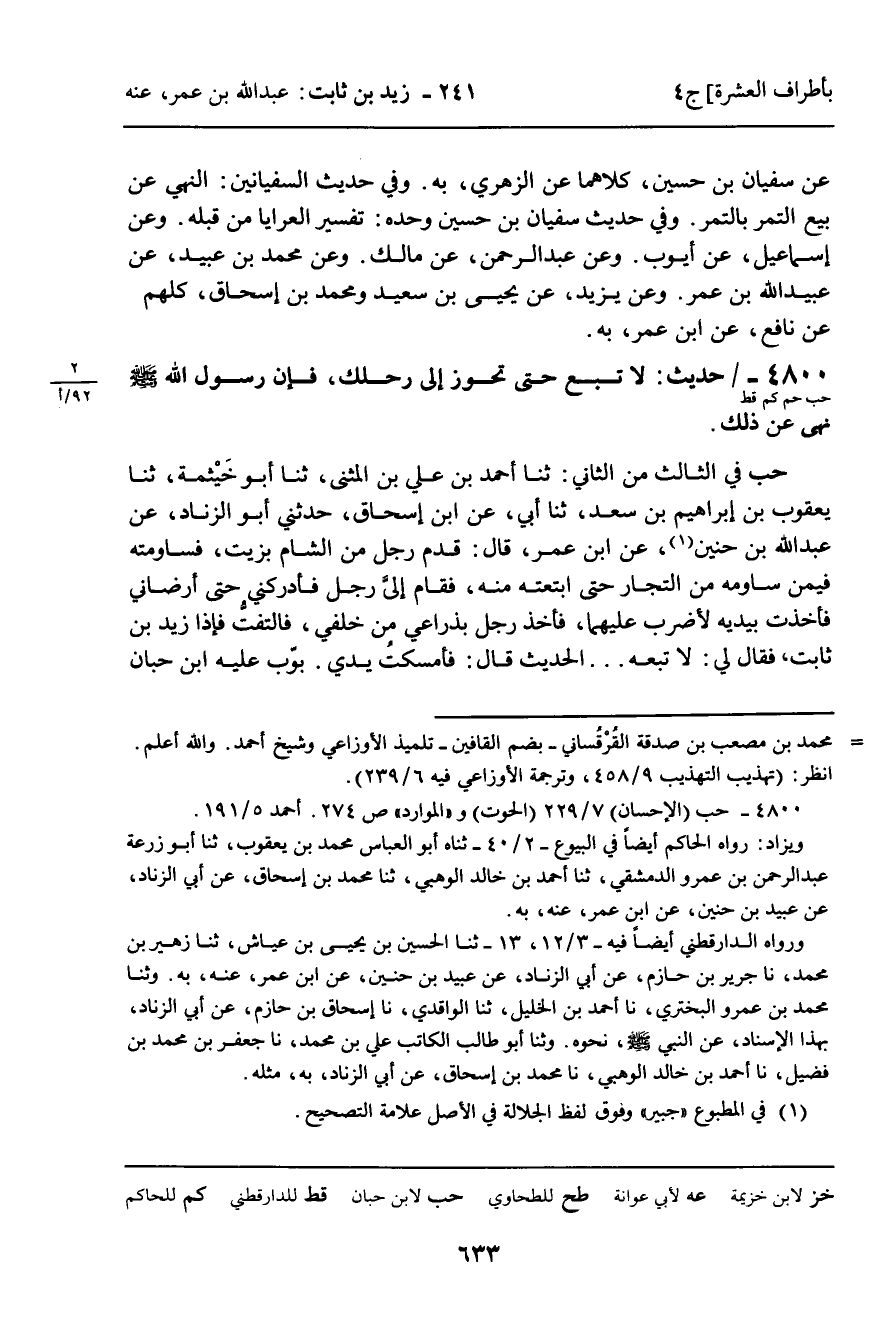 حب فِي الثَّالِثِ مِنَ الثَّانِي: ثنا أَحْمَدُ بْنُ عَلِيِّ بْنِ الْمُثَنَّى، ثنا أَبُو خَيْثَمَةَ، ثنا يَعْقُوبُ بْنُ إِبْرَاهِيمَ بْنِ سَعْدٍ، ثنا أَبِي، عَنِ ابْنِ إِسْحَاقَ، حَدَّثَنِي أَبُو الزِّنَادِ، عَنْ عَبْدِ اللَّهِ بْنِ حُنَيْنٍ، عَنِ ابْنِ عُمَرَ، قَالَ: قَدِمَ رَجُلٌ مِنَ الشَّامِ بِزَيْتٍ، فَسَاوَمْتُهُ فِيمَنْ سَاوَمَهُ مِنَ التُّجَّارِ حَتَّى ابْتَعْتُهُ مِنْهُ، فَقَامَ إِلَيَّ رَجُلُ فَأَدْرَكَنِي حَتَّى أَرْضَانِي فَأَخَذْتُ بِيَدَيْهِ لأَضْرِبَ عَلَيْهِمَا، فَأَخَذَ رَجُلٌ بِذِرَاعِي مِنْ خَلْفِي، فَالْتَفَتُّ فَإِذَا زَيْدُ بْنُ ثَابِتٍ، فَقَالَ لِي: لا تَبِعْهُ. . . الْحَدِيثَ قَالَ: فَأَمْسَكْتُ يَدِي. بَوَّبَ عَلَيْهِ ابْنُ حِبَّانَ