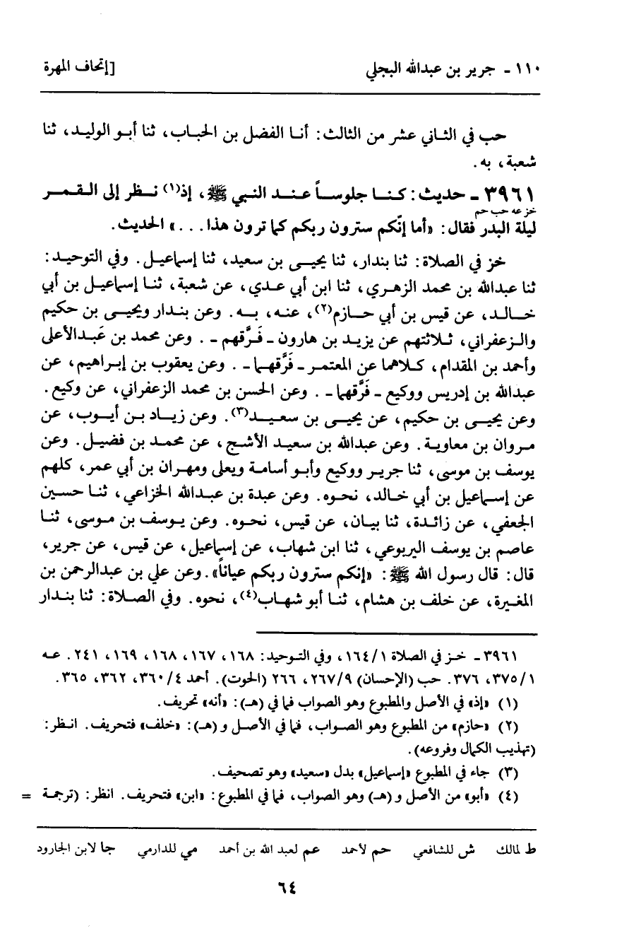 3961 - حَدِيثٌ (خز عه حب حم) : " كُنَّا جُلُوسًا عِنْدَ النَّبِيِّ صَلَّى اللَّهُ عَلَيْهِ وَسَلَّمَ، إِذْ نَظَرَ إِلَى الْقَمَرِ لَيْلَةَ الْبَدْرِ فَقَالَ: " أَمَا إِنَّكُمْ سَتَرَوْنَ رَبَّكُمْ كَمَا تَرَوْنَ هَذَا. . . " الْحَدِيثَ.