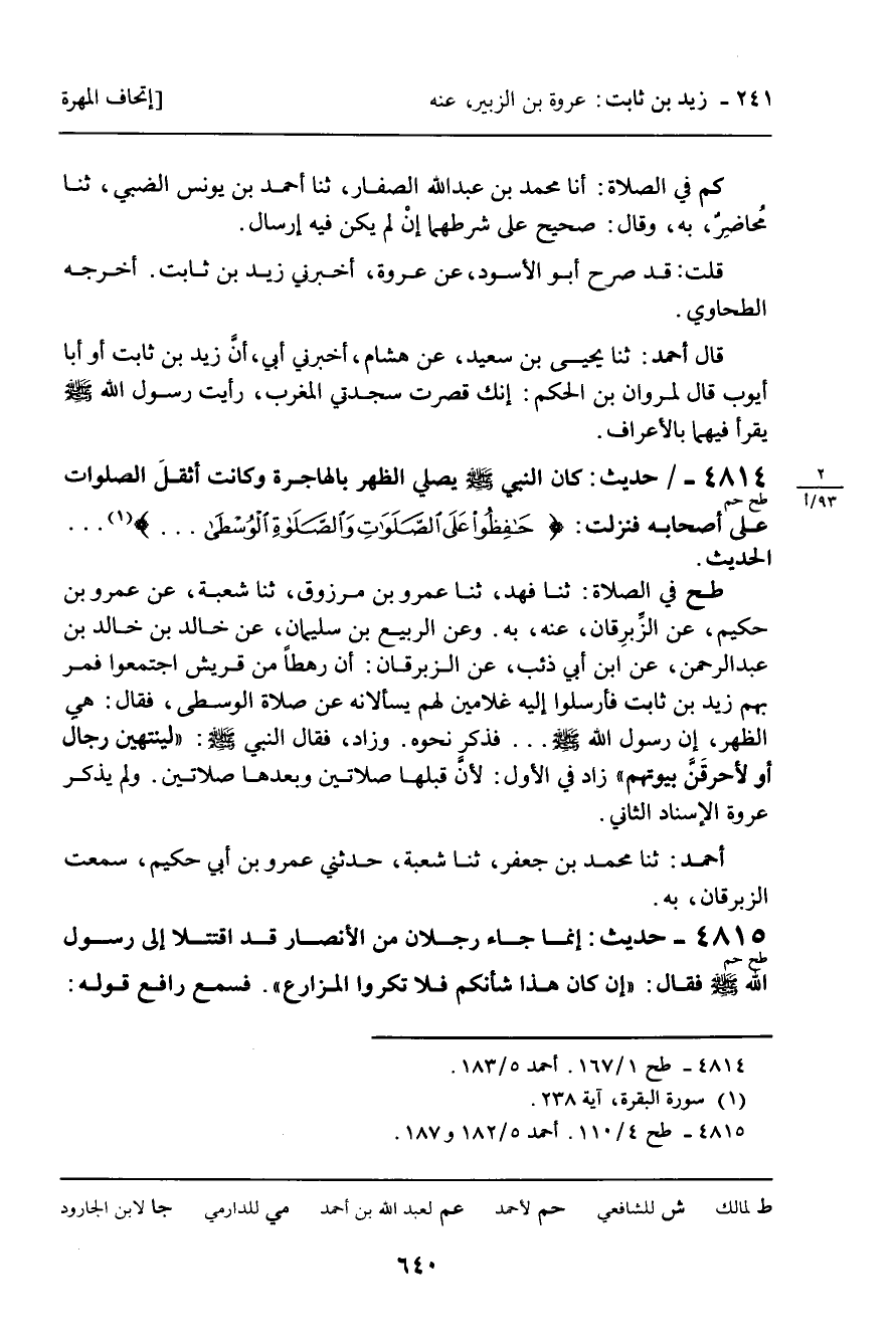 طح فِي الصَّلاةِ: ثنا فَهْدٌ، ثنا عَمْرُو بْنُ مَرْزُوقٍ، ثنا شُعْبَةُ، عَنْ عَمْرِو بْنِ حَكِيمٍ، عَنُ الزِّبْرِقَانِ، عَنْهُ، بِهِ. وَعَنِ الرَّبِيعِ بْنِ سُلَيْمَانَ، عَنْ خَالِدِ بْنِ خَالِدِ بْنِ عَبْدِ الرَّحْمَنِ، عَنِ ابْنِ أَبِي ذِئْبٍ، عَنِ الزِّبْرِقَانِ: أَنَّ رَهْطًا مِنْ قُرَيْشٍ اجْتَمَعُوا فَمَرَّ بِهِمْ زَيْدُ بْنُ ثَابِتٍ فَأَرْسَلُوا إِلَيْهِ غُلامَيْنِ لَهُمْ يَسْأَلانِهِ عَنْ صَلاةِ الْوُسْطَى، فَقَالَ: هِيَ الظُّهْرُ، إِنَّ رَسُولَ اللَّهِ صَلَّى اللَّهُ عَلَيْهِ وَسَلَّمَ. . . فَذَكَرَ نَحْوَهُ. وَزَادَ، فَقَالَ النَّبِيُّ صَلَّى اللَّهُ عَلَيْهِ وَسَلَّمَ: " لَيَنْتَهِيَنَّ رِجَالٌ أَوْ لأُحَرِّقَنَّ بُيُوتَهُمْ " زَادَ فِي الأَوَّلِ: لأَنَّ قَبْلَهَا صَلاتَيْنِ وَبَعْدَهَا صَلاتَيْنِ. وَلَمْ يَذْكُرْ عُرْوَةُ الإِسْنَادَ الثَّانِي.