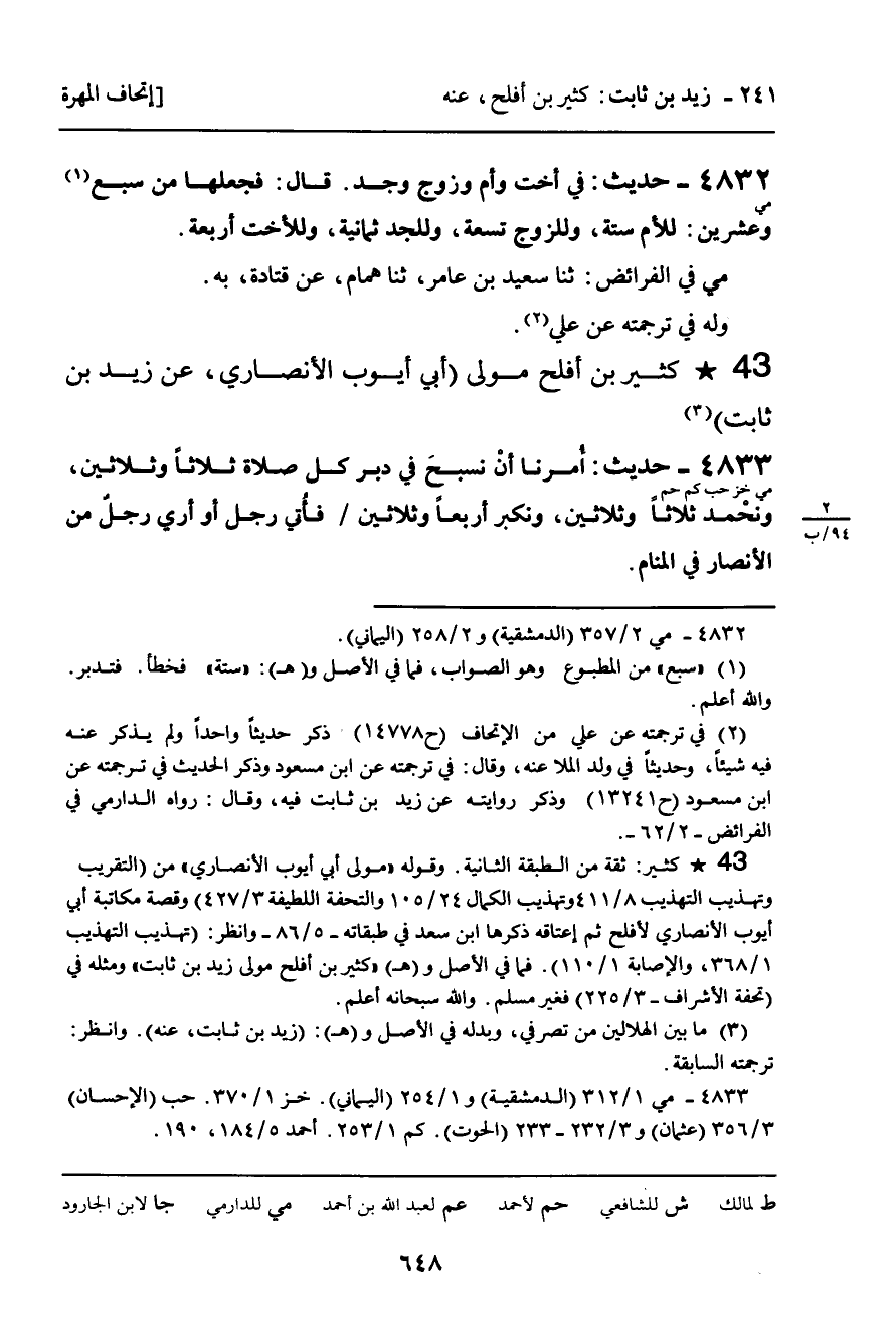4833 - حَدِيثٌ (مي خز حب كم حم) : كَثِيرُ بْنُ أَفْلَحَ مَوْلَى أَبِي أَيُّوبَ الأَنْصَارِيِّ، عَنْ زَيْدِ بْنِ ثَابِتٍ.