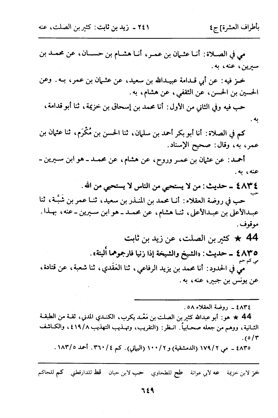 4835 - حَدِيثٌ (مي كم حم) : كَثِيرُ بْنُ الصَّلْتِ، عَنْ زَيْدِ بْنِ ثَابِتٍ، " الشَّيْخُ وَالشَّيْخَةُ إِذَا زَنَيَا فَارْجُمُوهُمَا أَلْبَتَةَ " الْحَدِيثَ.