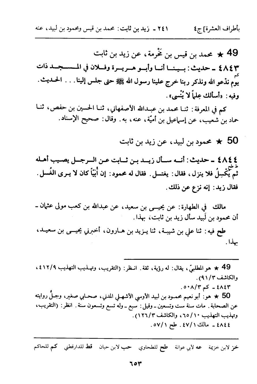 4844 - حَدِيثٌ (ط طح) : " أَنَّهُ سَأَلَ زَيْدَ بْنَ ثَابِتٍ عَنِ الرَّجُلِ يُصِيبُ أَهْلَهُ ثُمَّ يُكْسِلُ فَلا يُنْزِلُ، فَقَالَ: يَغْتَسِلُ. فَقَالَ لَهُ مَحْمُودٌ: إِنَّ أُبَيًّا كَانَ لا يَرَى الْغُسْلَ. فَقَالَ زَيْدٌ: إِنَّهُ نَزَعَ عَنْ ذَلِكَ " الْحَدِيثَ.
