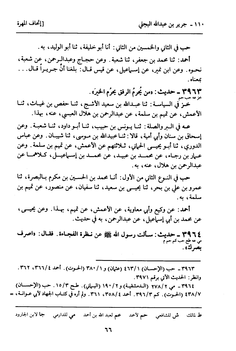 3964 - حَدِيثٌ (مي عه طح حب كم حم م) : " سَأَلْتُ رَسُولَ اللَّهِ صَلَّى اللَّهُ عَلَيْهِ وَسَلَّمَ عَنْ نَظْرَةِ الْفُجَاءَةِ. فَقَالَ: " اصْرِفْ بَصَرَكَ "