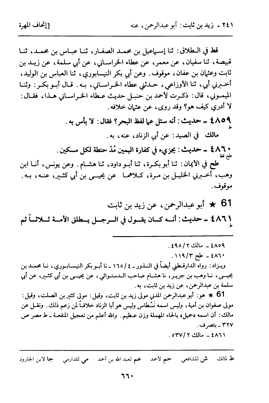 4861 - حَدِيثٌ (ط) : أَبُو عَبْدِ الرَّحْمَنِ، عَنْ زَيْدِ بْنِ ثَابِتٍ. " أَنَّهُ كَانَ يَقُولُ فِي الرَّجُلِ يُطَلِّقُ الأَمَةَ ثَلاثًا ثُمَّ